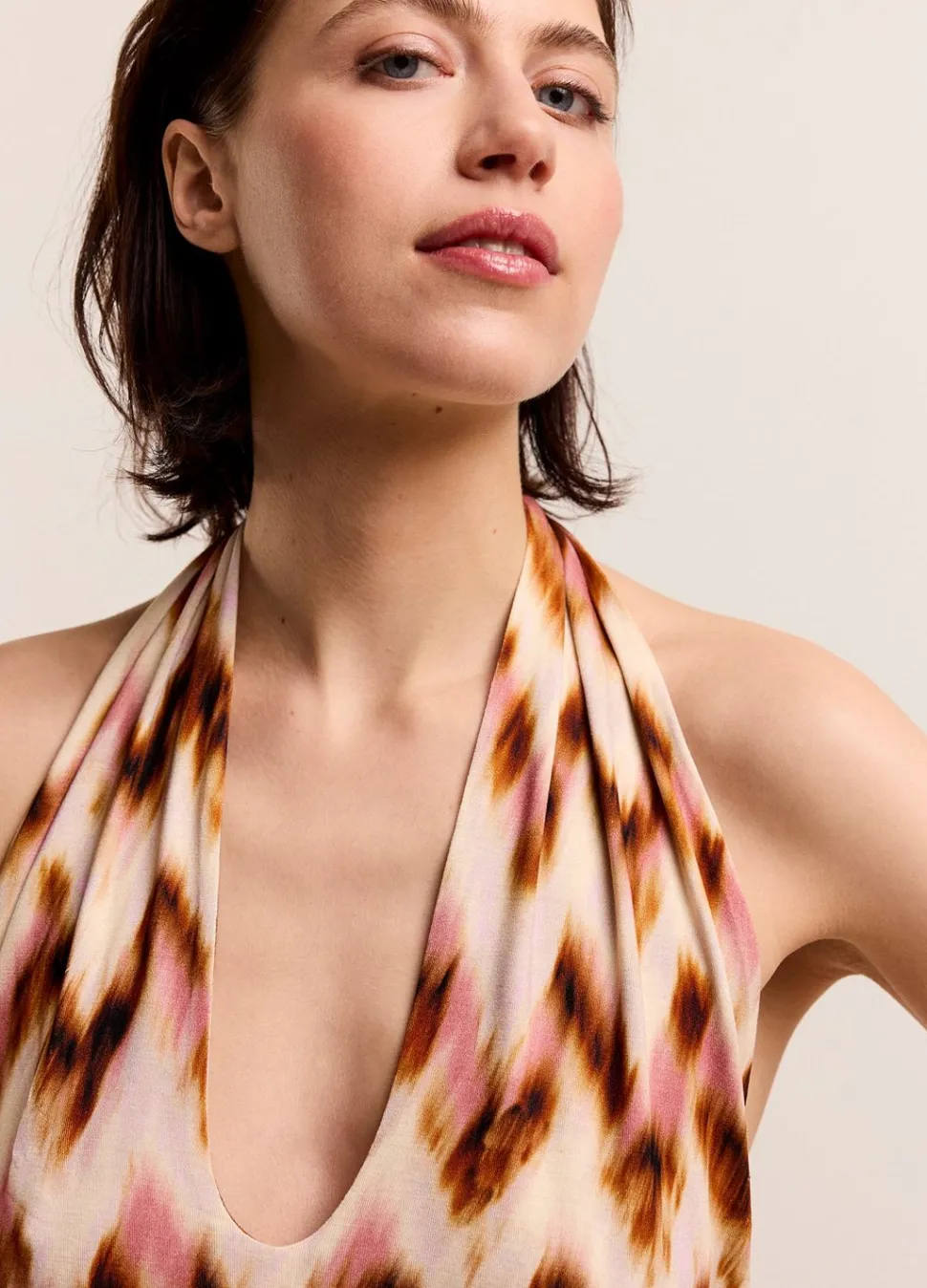 A-Lijn Halterjurk Met Knoopsluiting In De Nek, Gemaakt Van Een Zachte Viscose-Jersey Stof. De Jurk Is Bedruk Met Een Zigzag Patroon En Valt Net Boven De Enkel.