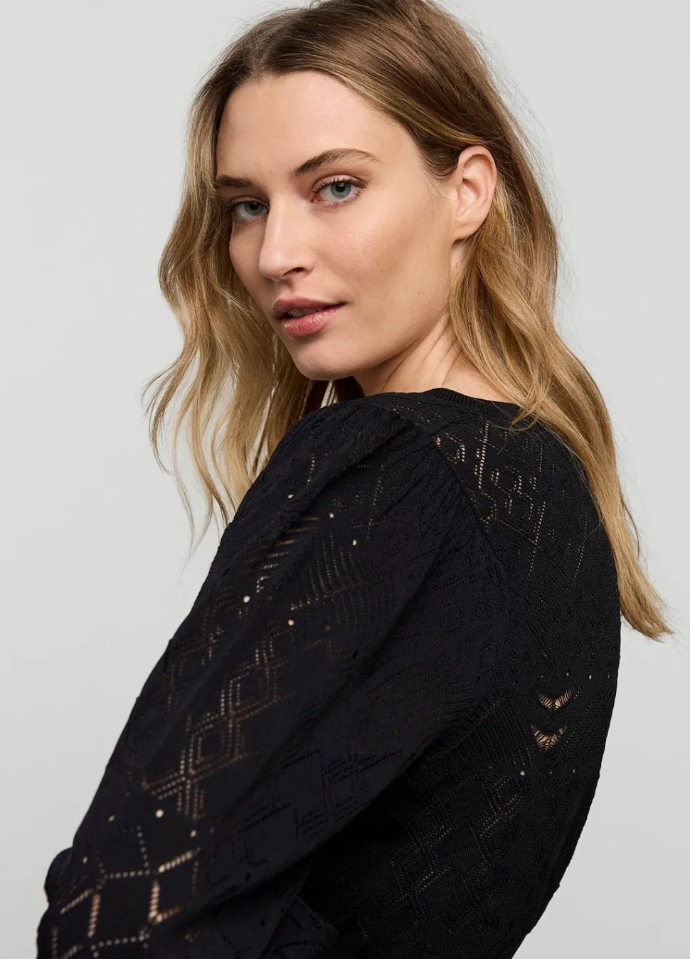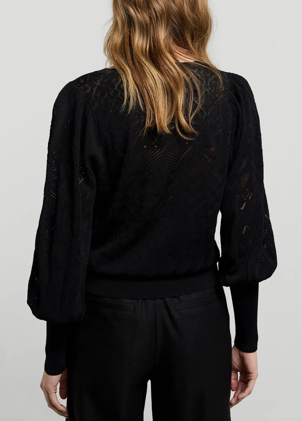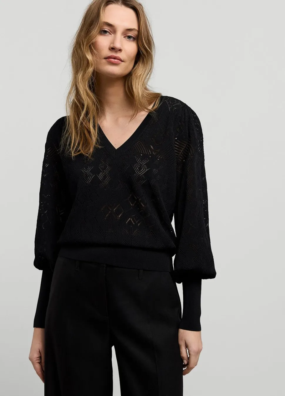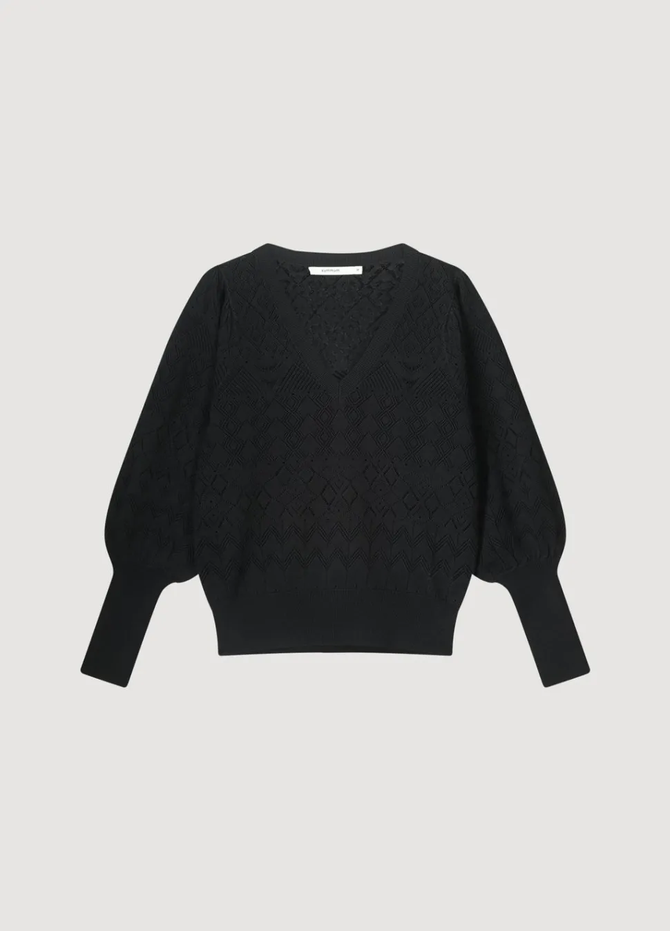 Fijngebreide Trui Van Een Viscose-Polyamide Garen In Een Geometrisch Ajour Patroon. Het Truitje Heeft Een V-Hals En Pofmouwen Met Brede Ribboorden.
