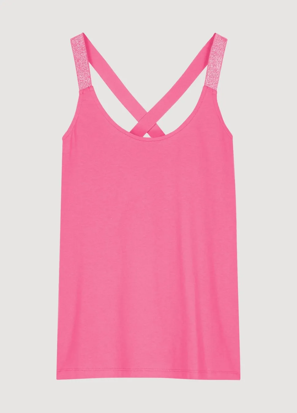 Basis Singlet Met Kruisband Op De Rug, Gemaakt Van Katoen Elastaan Tricot Stof. De Top Heeft Een Nauwsluitende Pasvorm En Opvallende Glitterbandjes.