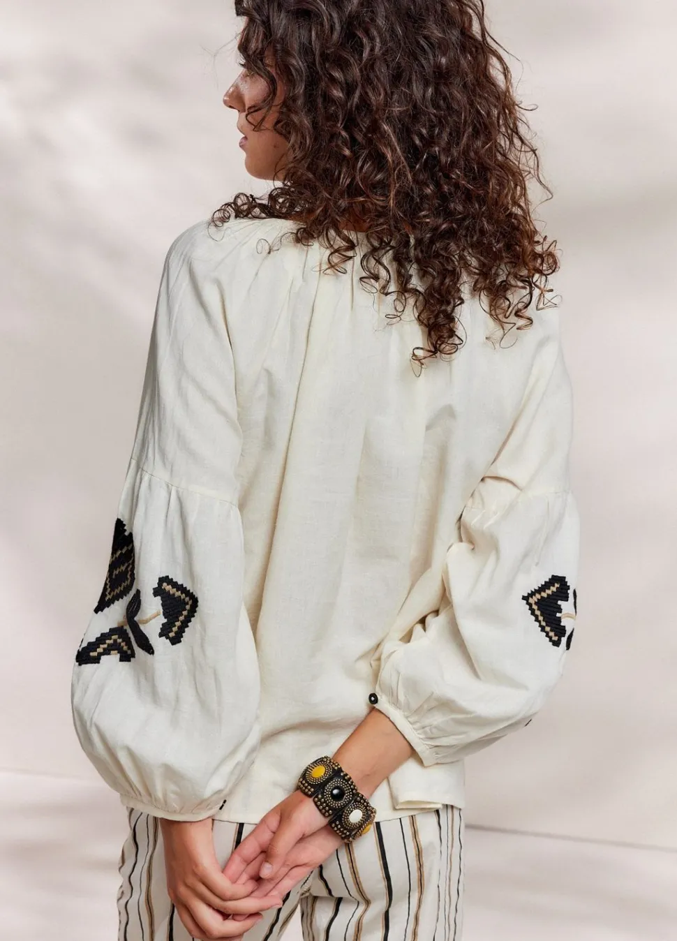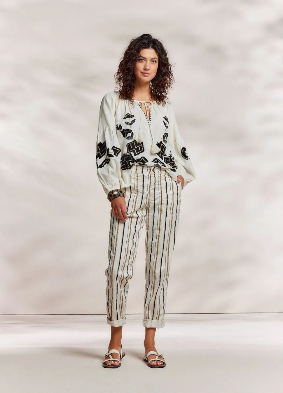Ruimvallende Top Met Brede Ronde Hals In Een Zachte Katoen-Linnen Mix. De Blouse Is Versierd Met Borduurwerk En Heeft Een Koordsluiting Met Kwastjes.