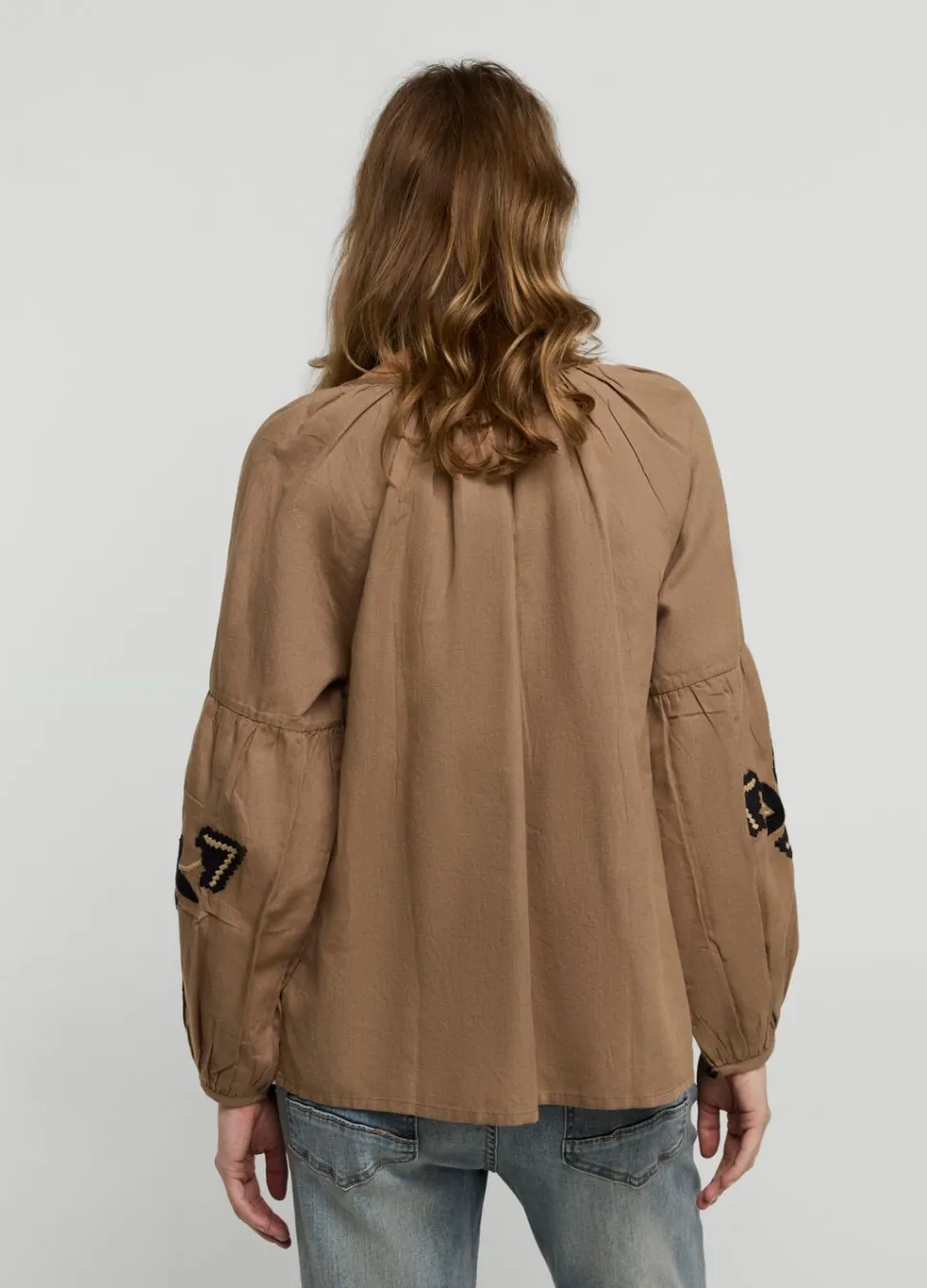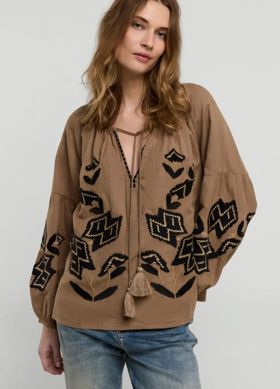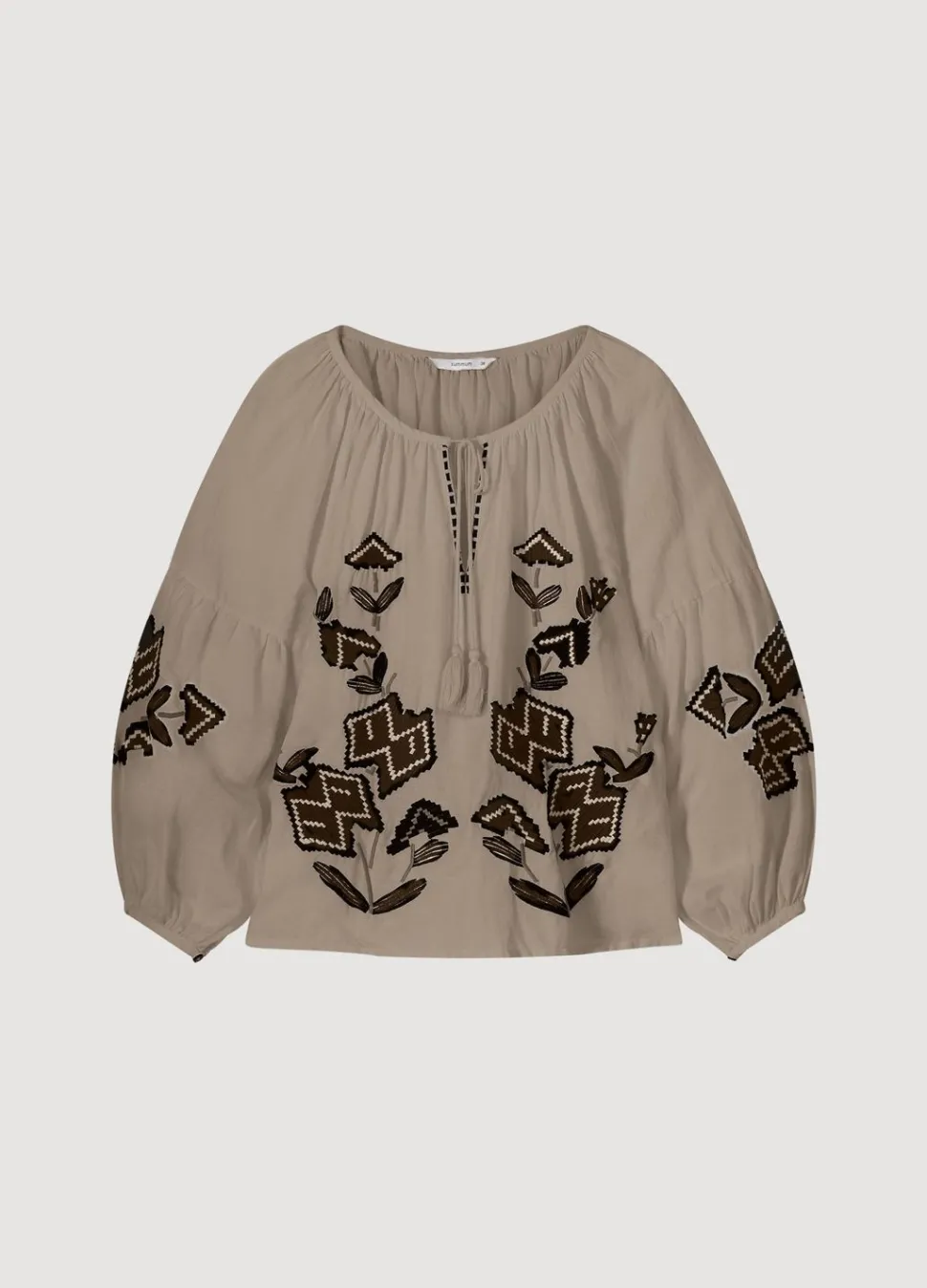 Ruimvallende Top Met Brede Ronde Hals In Een Zachte Katoen-Linnen Mix. De Blouse Is Versierd Met Borduurwerk En Heeft Een Koordsluiting Met Kwastjes.