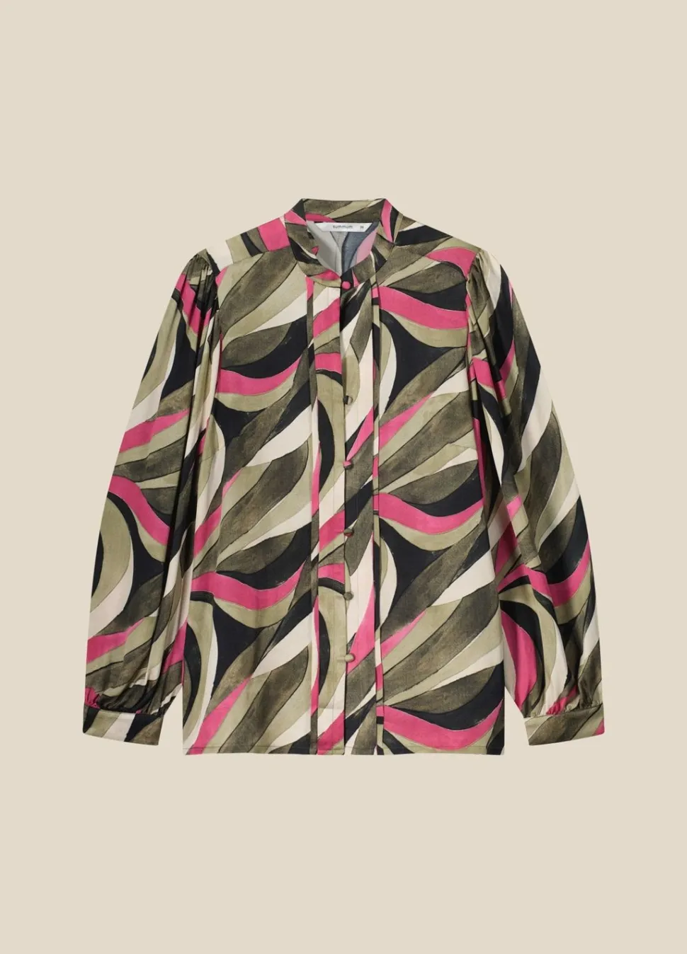 Blouse Met Staanderkraag En Iets Gepofte Mouwen Gemaakt Van Een Soepelvallende Stof. De Knopenlijst Is Versierd Met Een Rechte Bies En Heeft Stoffen Knoopjes.