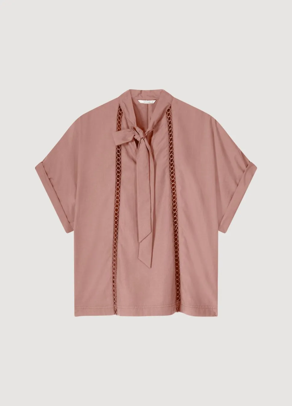 Bow Tie Top Met Korte Mouwen In Een Lyocell Katoen Stof. De Blouse Heeft Een Rechte Pasvorm En Het Voorpand Is Versierd Met Kantband.