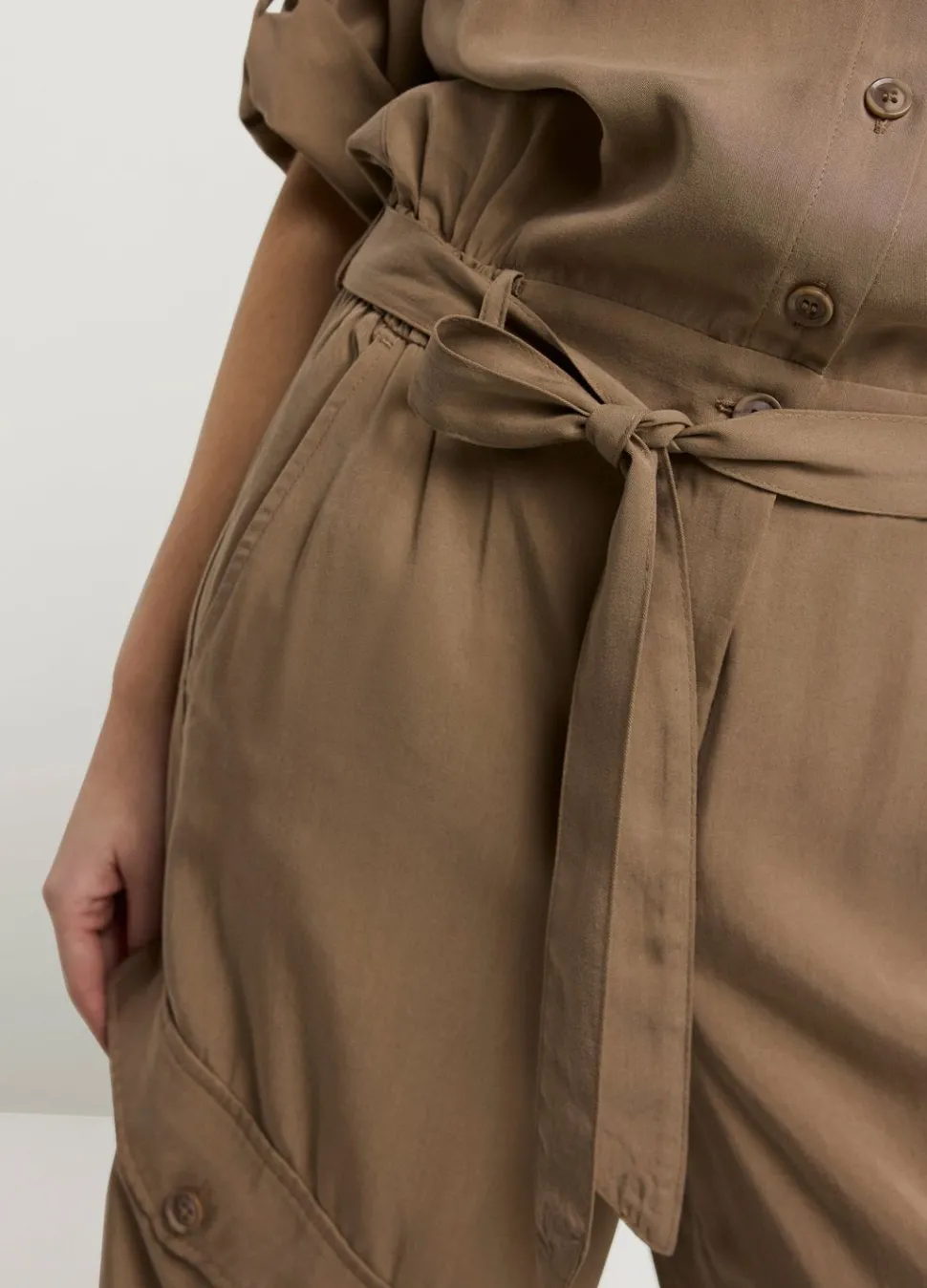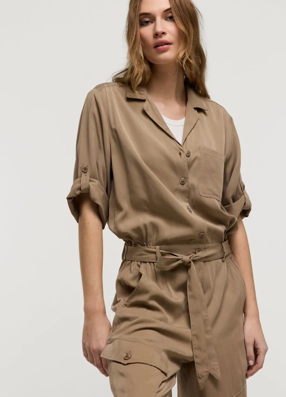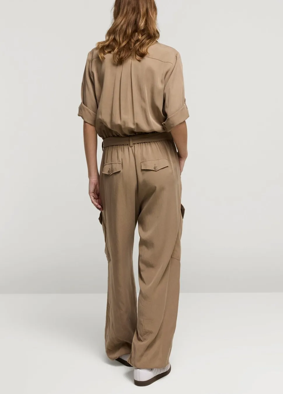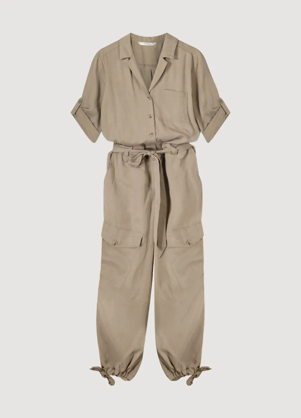 Cargo Jumpsuit Met Reverskraag En Oprolbare Mouwen. De Jumpsuit Heeft Een Elastische Tailleband Met Een Stoffen Riem En Een Koordje In De Pijpen Voor Extra Pof-Effect.