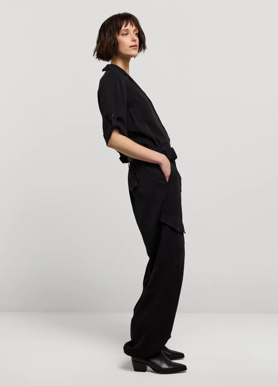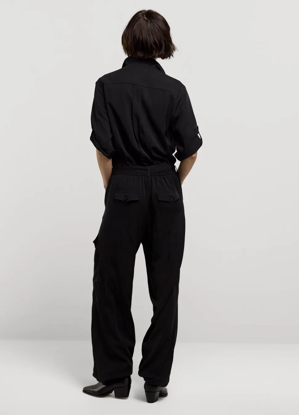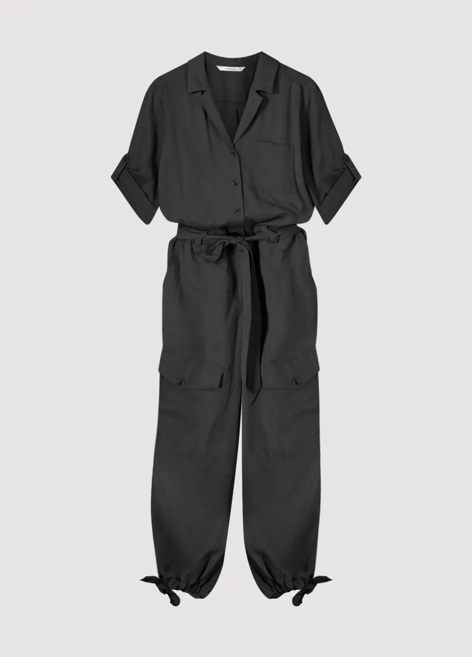 Cargo Jumpsuit Met Reverskraag En Oprolbare Mouwen. De Jumper Heeft Een Elastische Tailleband Met Een Stoffen Riem En Een Koordje In De Pijpen Voor Extra Pof-Effect.
