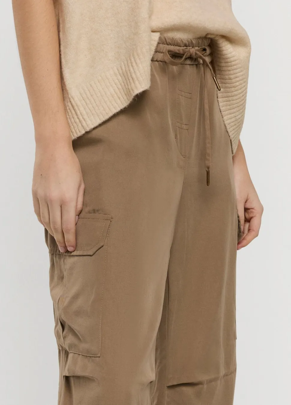 Soepelvallende Cargobroek Met Elastische Tailleband En Verstelbaar Elastiek In De Broekspijpen. De Broek Heeft Opgestikte Klepzakken Aan De Zijkant.