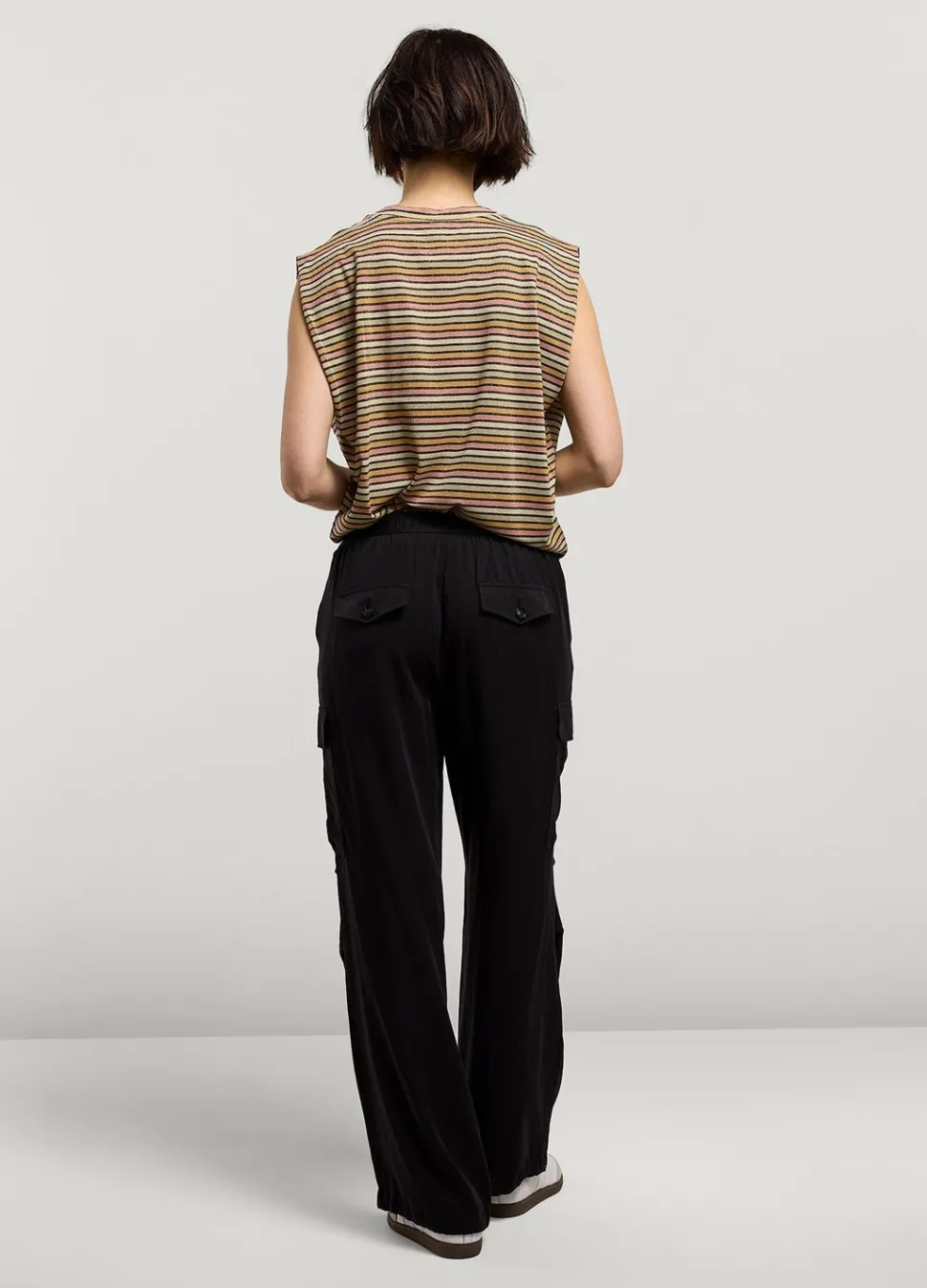 Soepelvallende Cargobroek Met Elastische Tailleband En Verstelbaar Elastiek In De Broekspijpen. De Broek Heeft Opgestikte Klepzakken Aan De Zijkant.