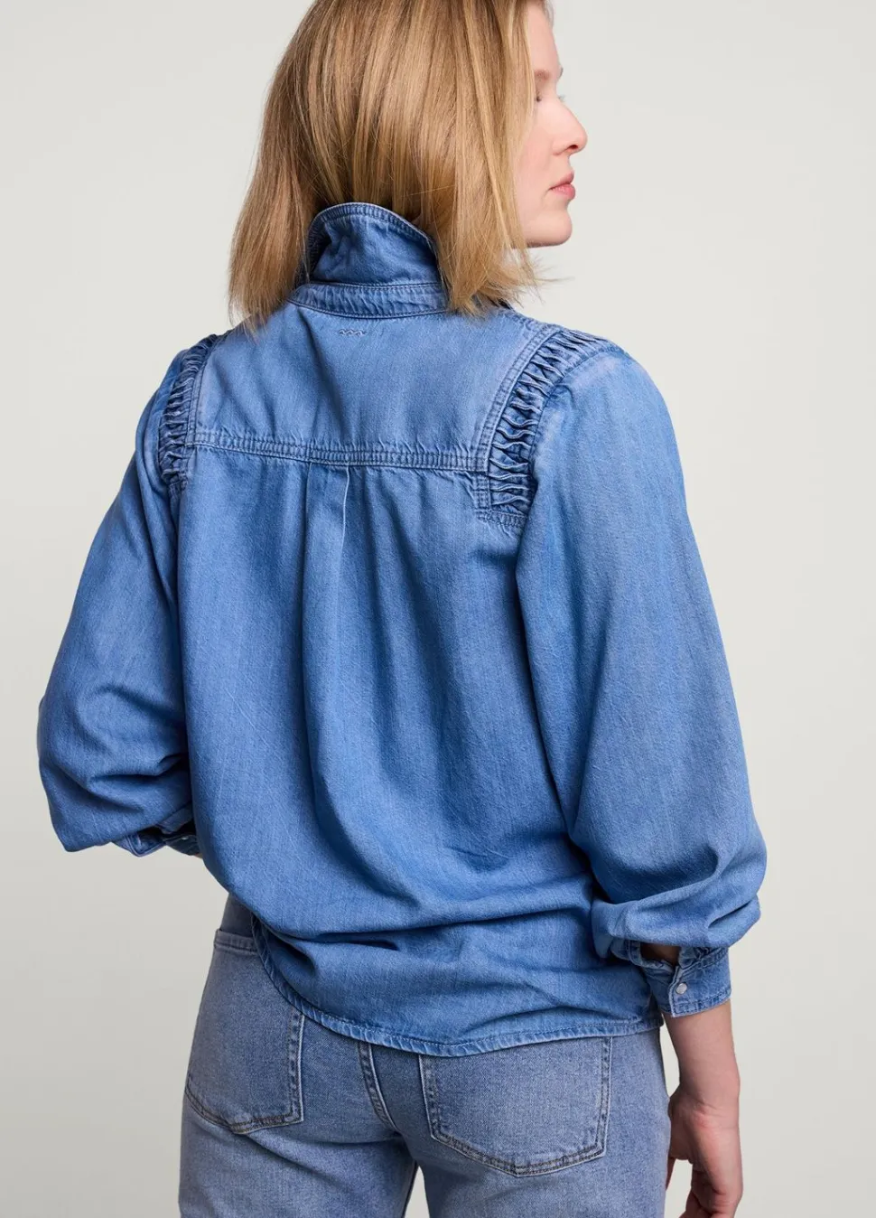 Denim Blouse In Een Soepele Non-Stretch Denim. De Blouse Heeft Een Knoopsluiting Met Parelmoer-Look Drukknoopjes En Decoratieve Plooien Op De Mouwaanzet.