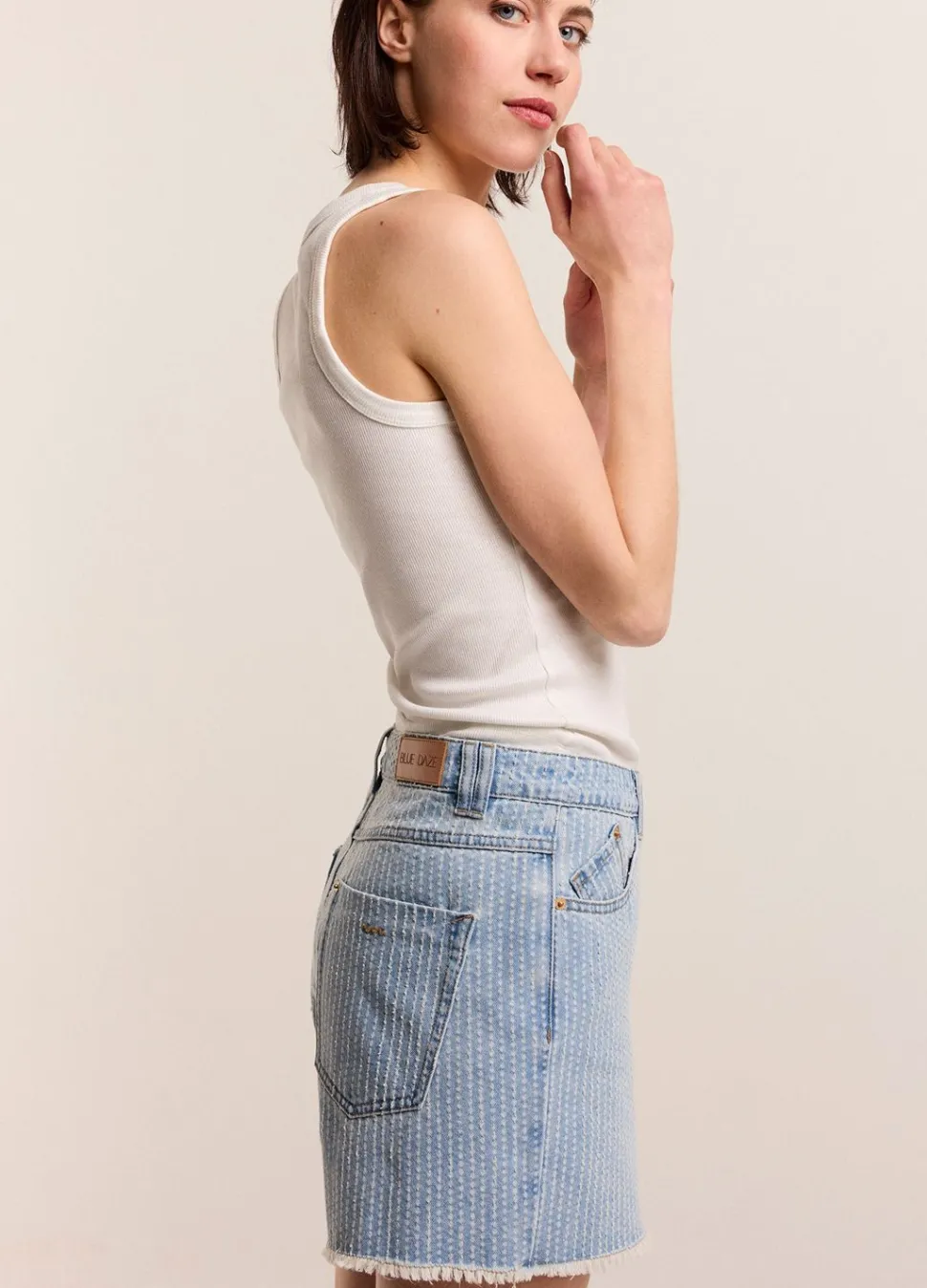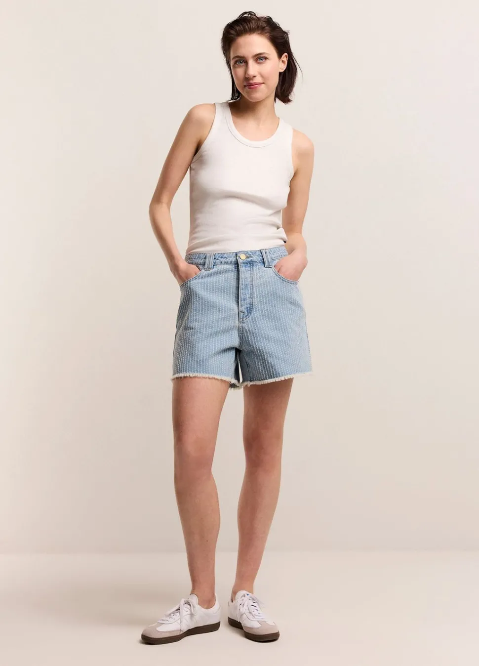 Denim Short Van 100% Katoen In Een Fijne Twill Denim Met Een Speciaal Lasergesneden Streepontwerp. De Korte Broekspijpen Hebben Een Gerafelde Afwerking.