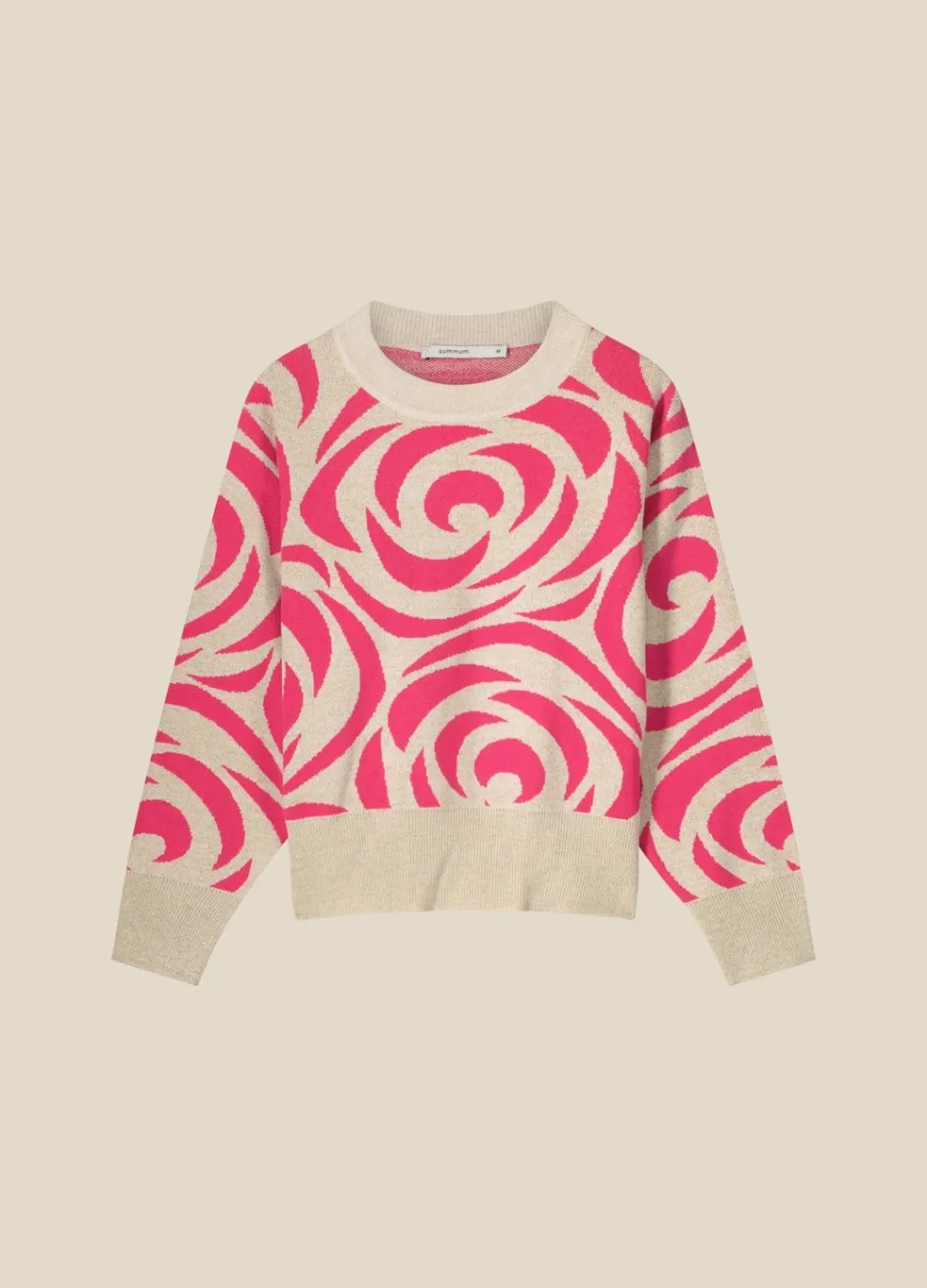 Gebreide Trui Met Groot Rozen-Patroon In Jacquard Breiwerk. In Het Garen Zit Een Verfijnd Lurex Garen Meegebreid. De Trui Heeft Een Rechte Fit, Ronde Hals En Brede Geribde Boorden.