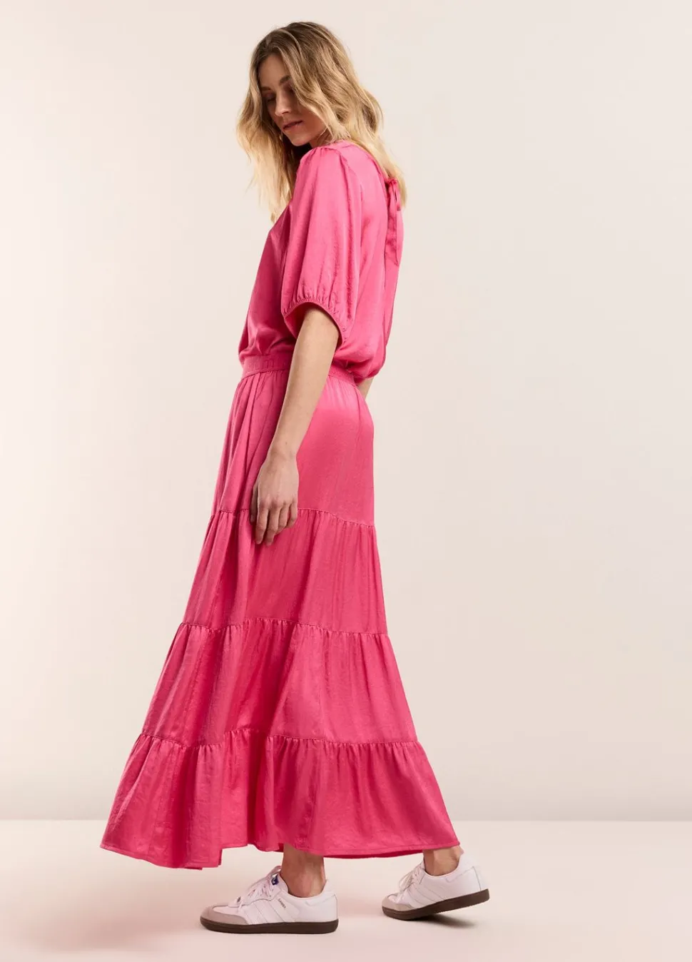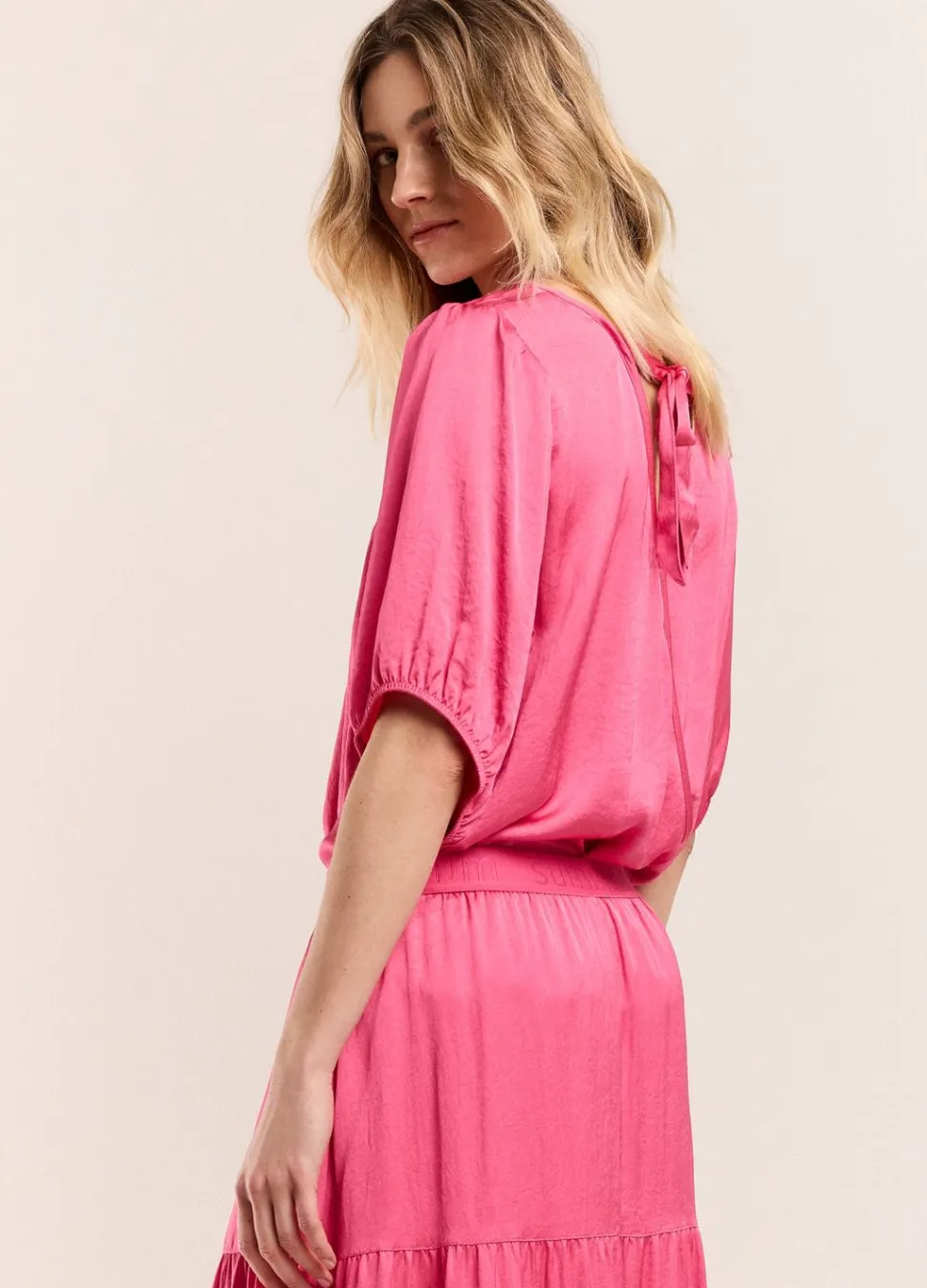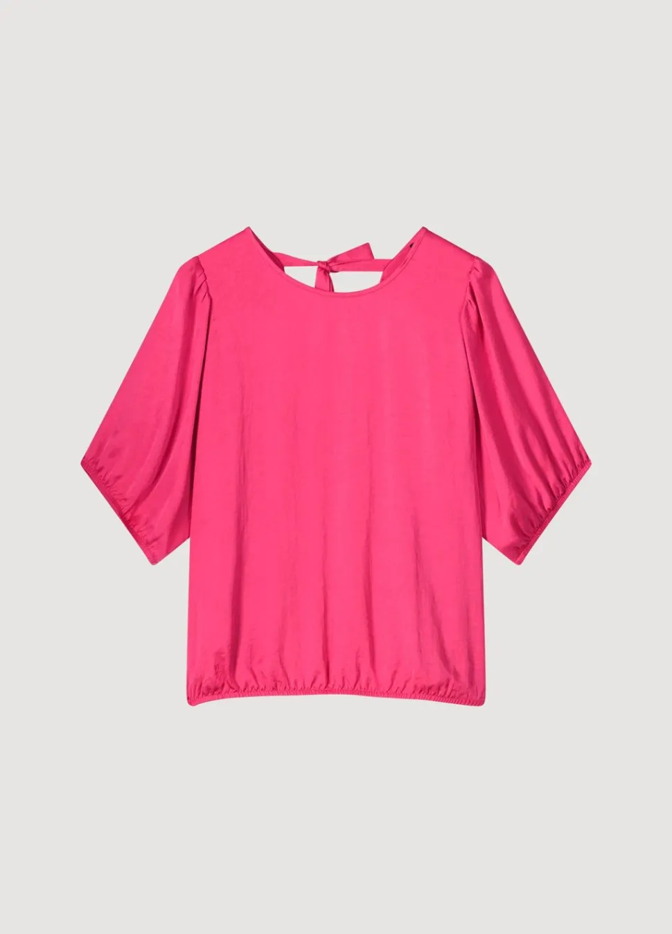 Reversibel Top Met Korte Pofmouw Gemaakt Van Een Soepele Licht Glanzende Stof. De Top Heeft Aan Één Kant Een Ronde Hals En Aan De Andere Kant Een Overslag En Strik Op De Halslijn. Aan Beide Kanten Draagbaar.