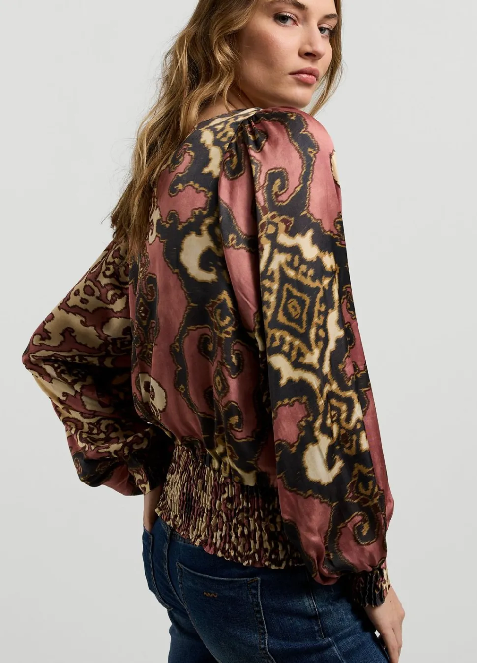 Top Met Ronde Hals En Splitje In De Nek Gemaakt Van Een Licht Glanzende, Bedrukte Stof. De Top Heeft Pofmouwen Met Gedeeltelijk Gesmokte Manchetten.