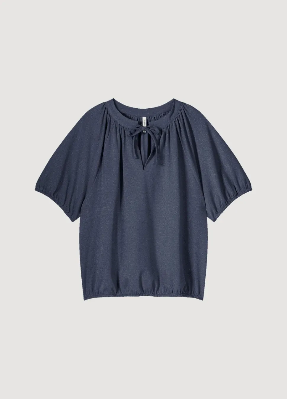 Glimmende Top Van Rekbare Lurex-Stof Met Metallic Garen En Korte Mouwtjes Met Elastiek. De Top Heeft Een Ronde Hals Met Split, Een Koordsluiting En Een Elastische Onderkant.