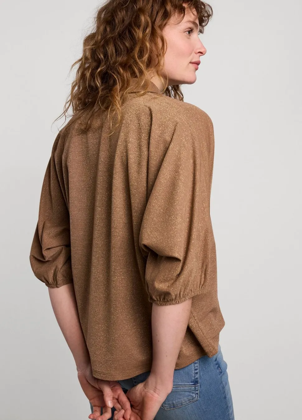Glimmende Blouse Van Rekbare Jersey-Stof Met Metallic Garen En 3/4 Ballonmouwtjes. De Top Heeft Een Ruime Pasvorm, Overhemdkraag En Knoopsluiting Met Stoffen Knoopjes.