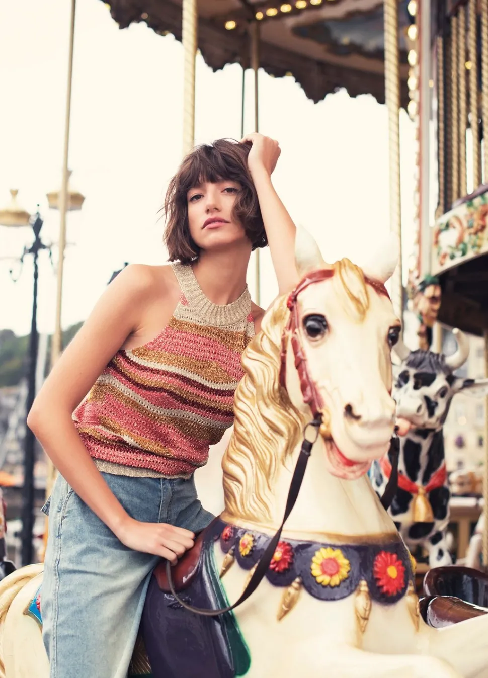 Gebreide Haltertop Gemaakt Van Een Glinsterende Garenmix. De Top Heeft Een Kleurrijk Ajourpatroon En Is Afgewerkt Met Brede Geribde Boorden.