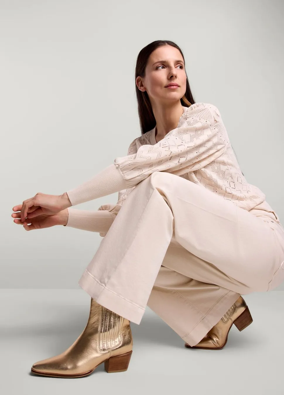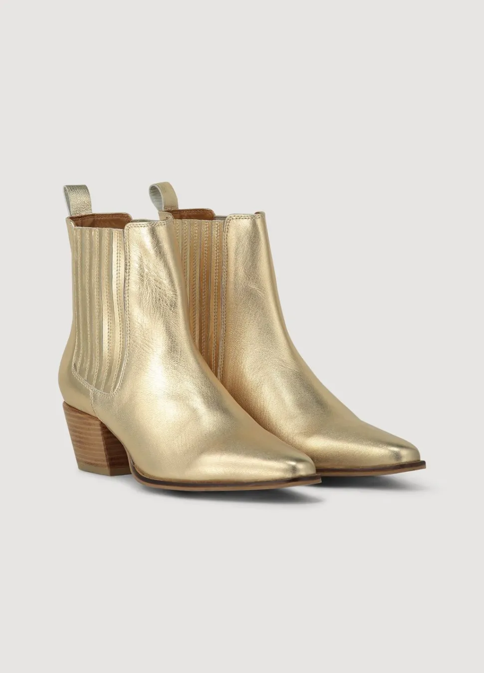 Halfhoog Laarsje In Een Witgouden Metallic Kleur. De Schacht Is Zowel Aan De Binnen- Als De Buitenkant Uitgevoerd Met Elastiek. Br≫
