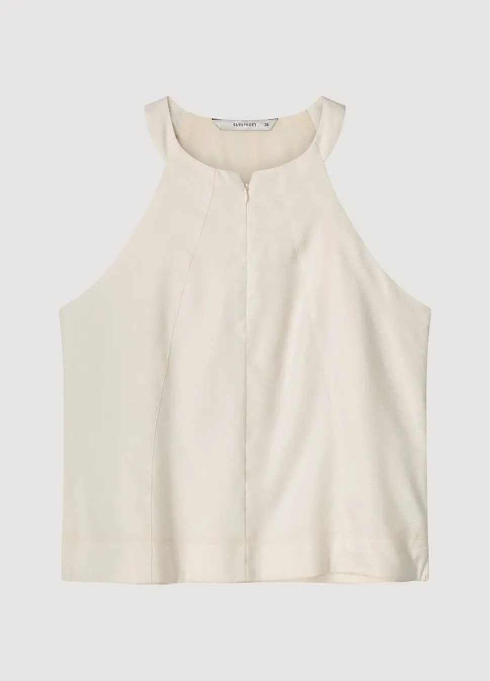 Haltertop Met Hoge Ronde Hals Voorzien Van Blinde Rits In Het Midden. De Top Heeft Een Rechte Fit En Splitjes Aan De Zijkant.