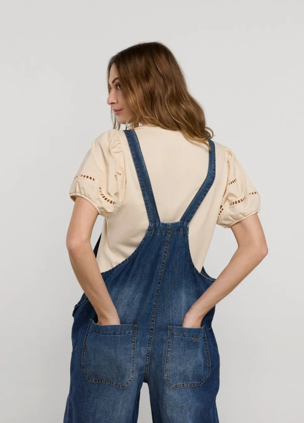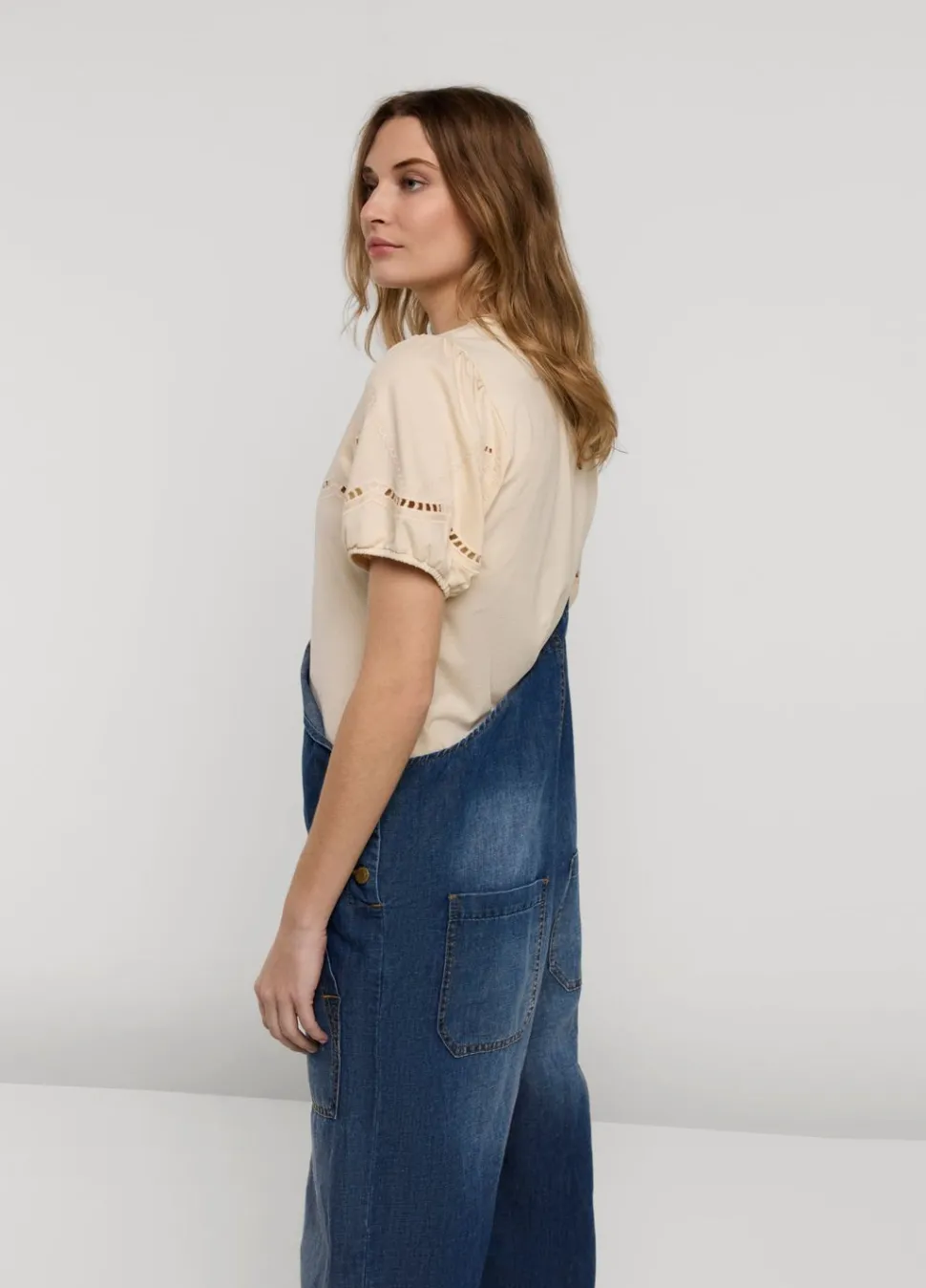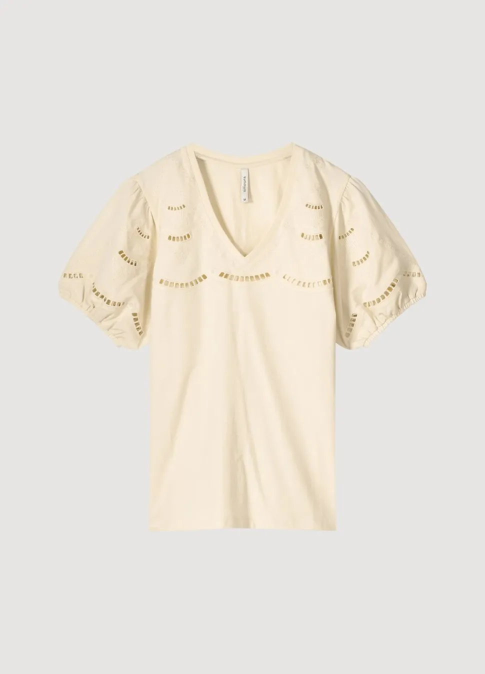 V-Hals Top Met Een Normale Pasvorm Ivan Een Rekbare Viscose Mix Jersey Kwaliteit. De Top Heeft Korte Mouwen Met Elastische Boord En Broderie Anglaise Details Op Mouwen En Borst.