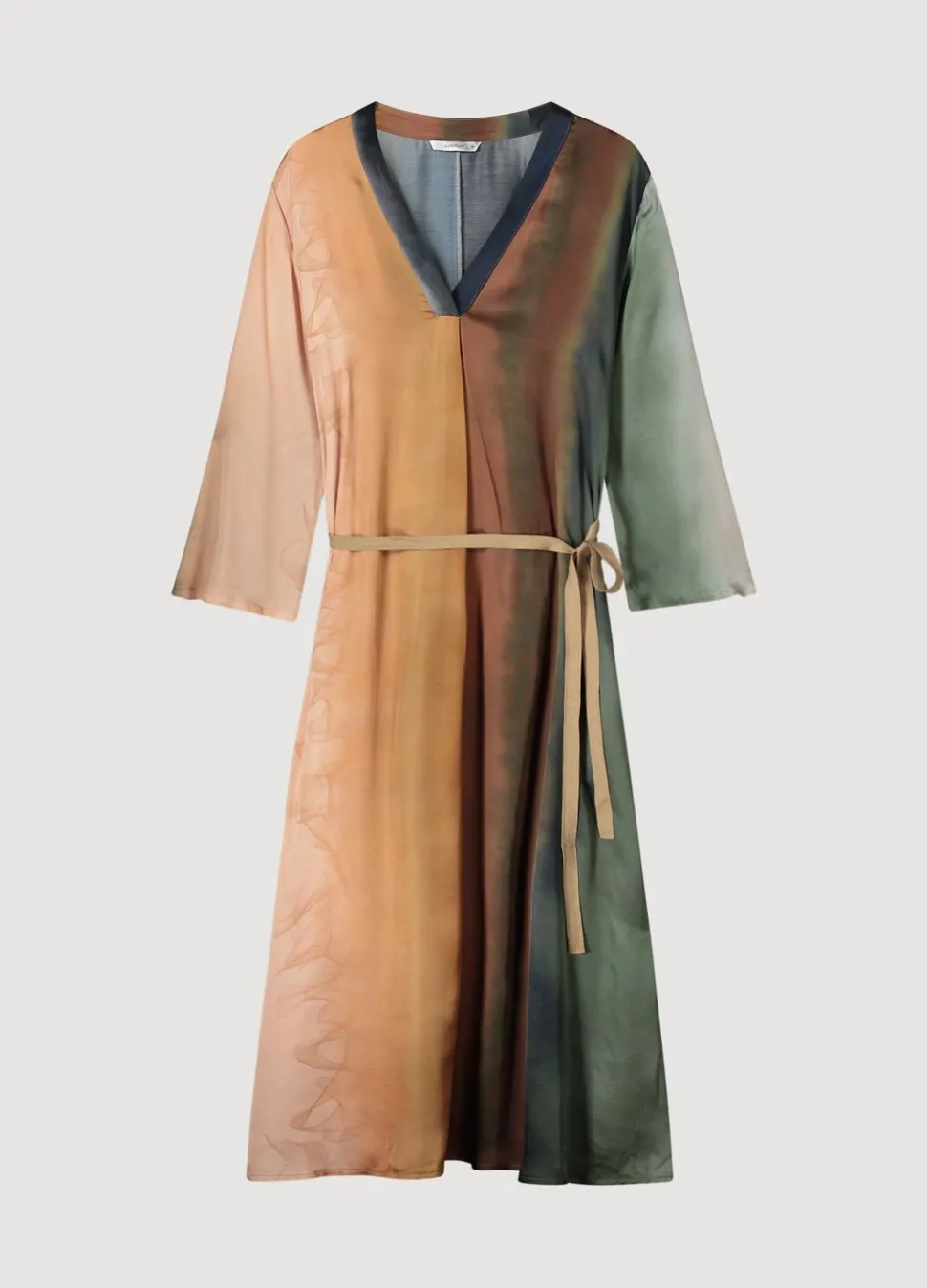 Licht Glanzende Jurk Met Een Zakken In De Zijnaad En Een Koord In De Taille. De Jurk Heeft Een Brede V-Hals En Iets Wijduitlopende Mouwen. Door De Willekeurige Print Is Iedere Jurk Uniek.