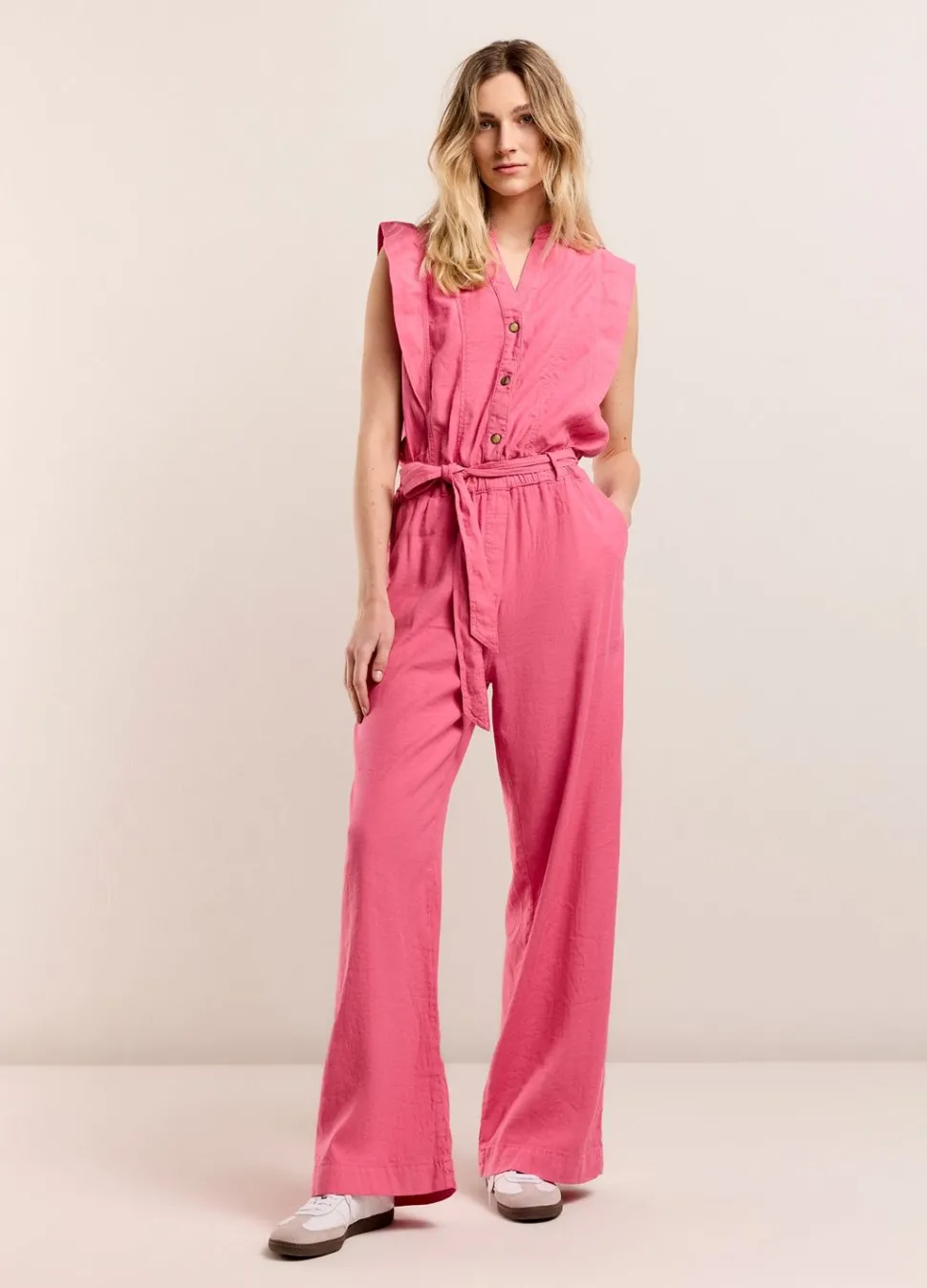 Mouwloze Jumpsuit Van Een Soepele Katoen-Linnen Stretchkwaliteit. De Jumpsuit Heeft Een Staanderkraag En V-Hals Met Drukknoopsluiting.