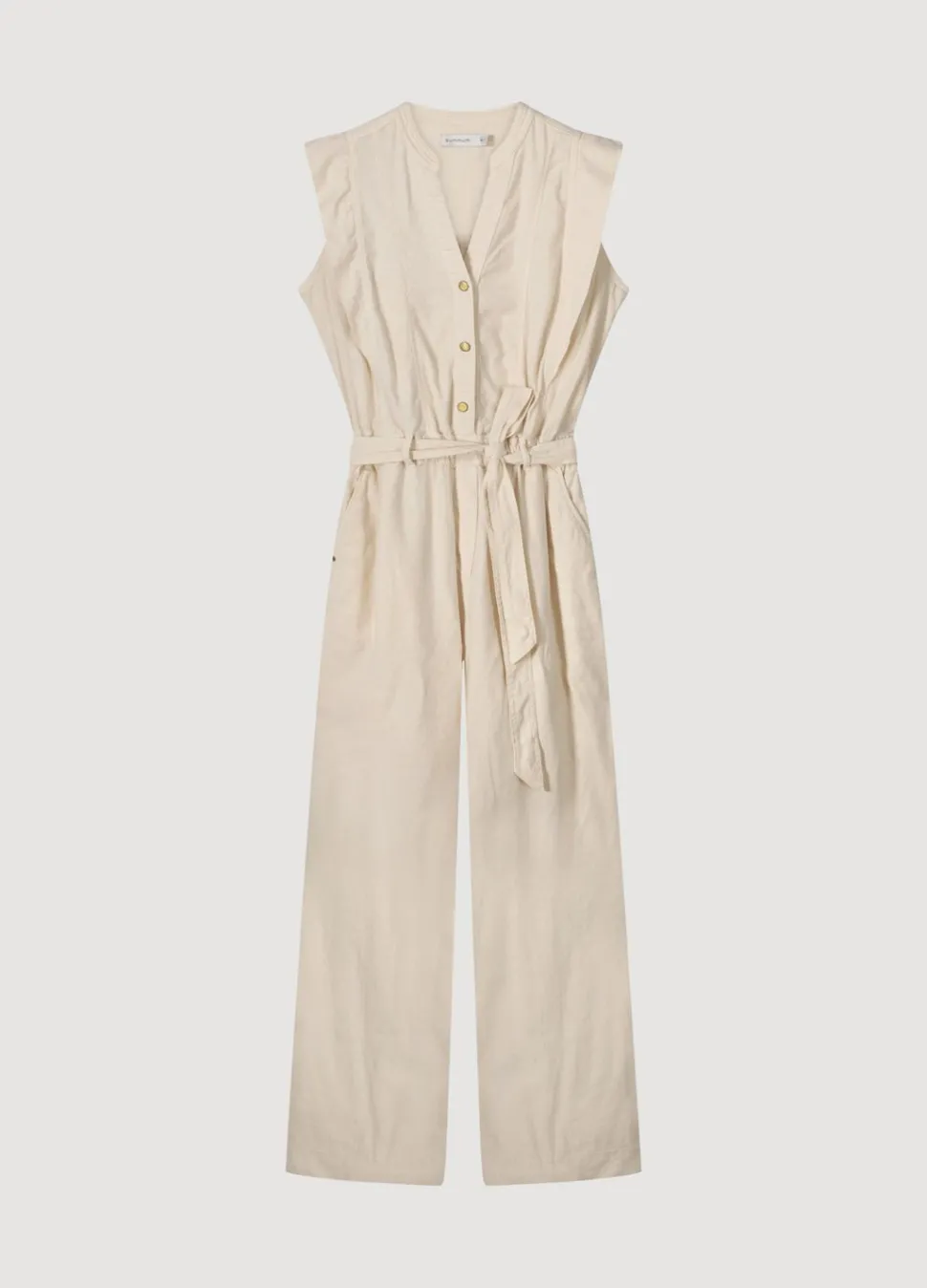 Mouwloze Jumpsuit Van Een Soepele Katoen-Linnen Stretchkwaliteit. De Jumpsuit Heeft Een Staanderkraag En V-Hals Met Drukknoopsluiting.