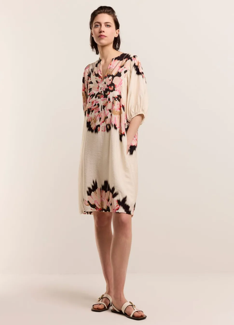 Soepelvallende Korte Jurk Met Pofmouwen. De Jurk Heeft Een Stoffen Koordje In De Taille En Een Ronde Hals Met V-Split. Door De Willekeurige Print Is Iedere Jurk Uniek.