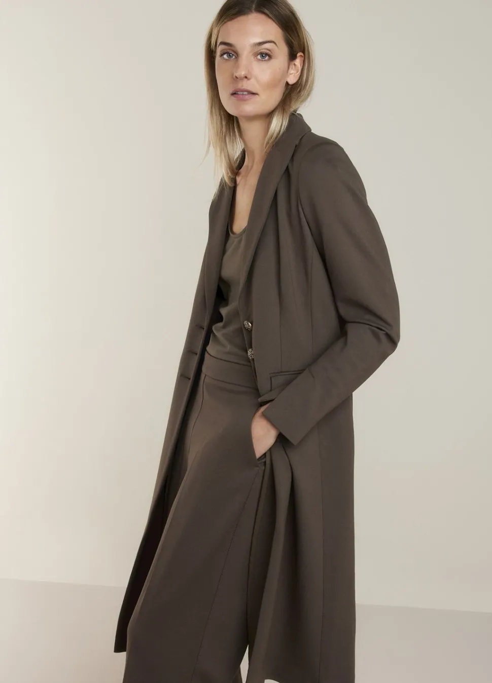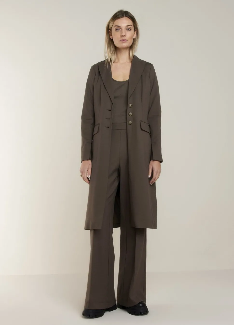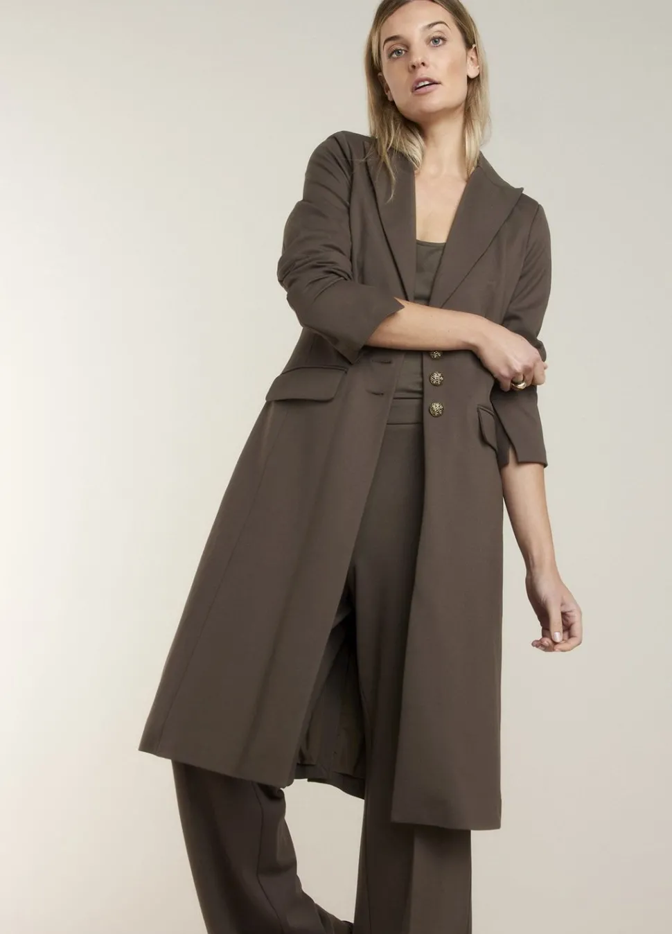 Lange Punto Milano Blazer Ontworpen In Een Zachte Stretchstof Met Getailleerde Fit Op Het Bovenlijf En Een Rechte Fit Naar Onderen. De Blazer Heeft Een Knoopsluiting Met Drie Gouden Knopen En Grote Klepzakken Aan De Voorzijde.