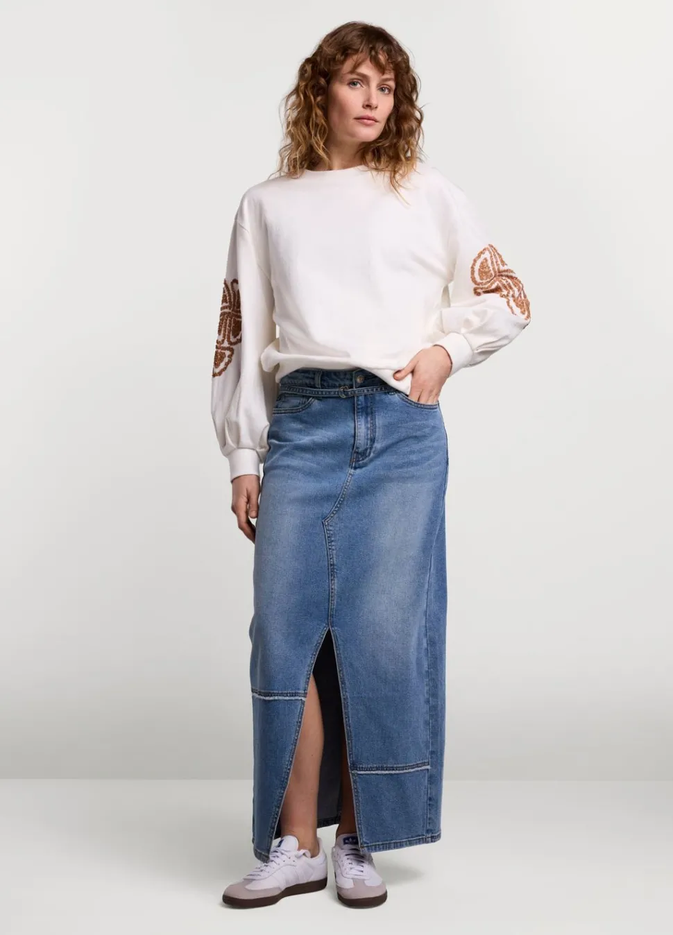 Lange Denim Rok Gemaakt Van Een Stevige Denim Kwaliteit Met Lichte Stretch. De Rok Is Ontworpen Met Een Grote Split Voor En Achter.