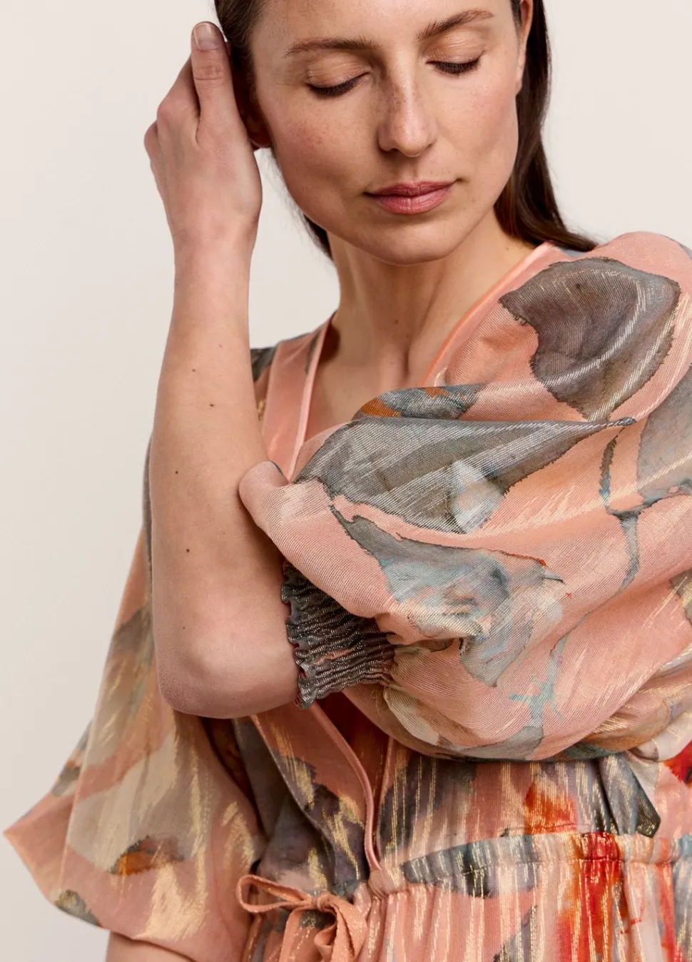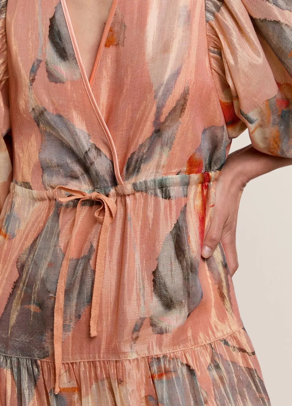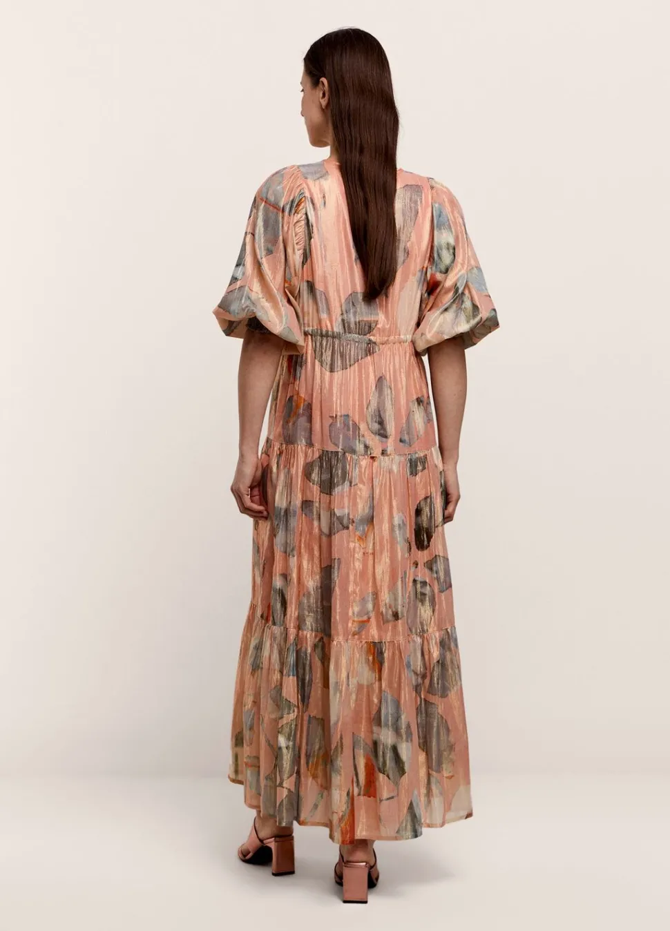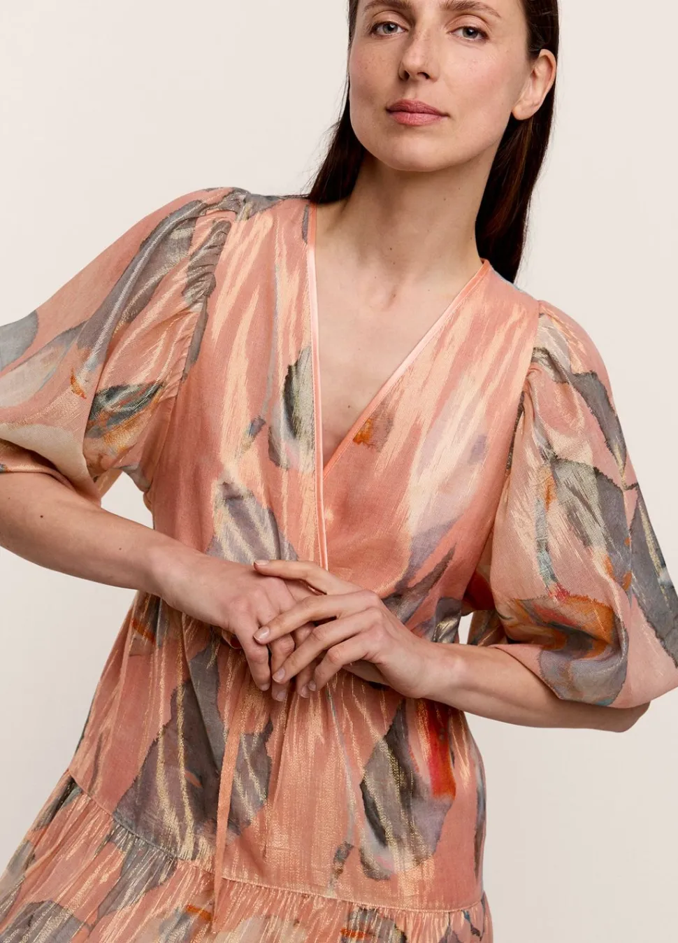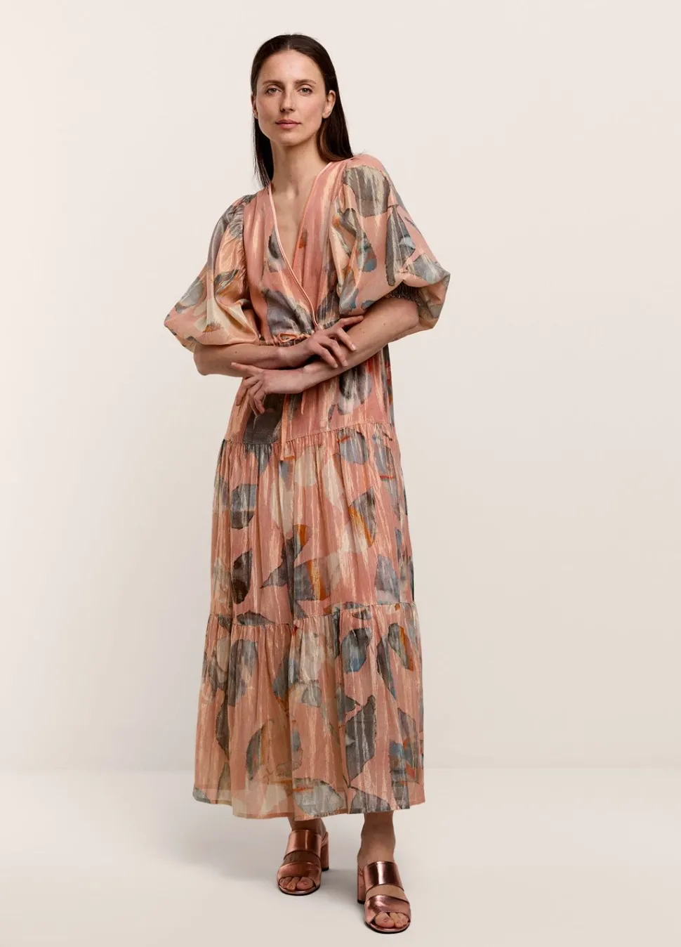 Lange Strokenjurk Met Overslagtop Gemaakt In Een Glinsterende Lurex Garenmix. De Jurk Heeft Pofmouwen Met Gedeeltelijk Gesmokte Manchetten.