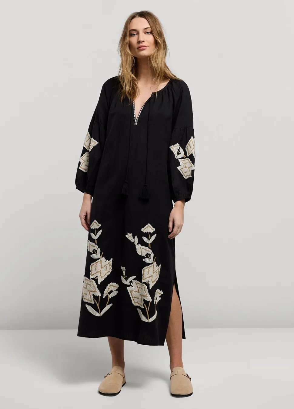 Ruimvallende Lange Jurk Met Ceintuur In Een Zachte Katoen-Linnen Mix. De Blouse Is Versierd Met Borduurwerk En Heeft Een Brede Ronde Hals Met Split En Koordsluiting Met Kwastjes.