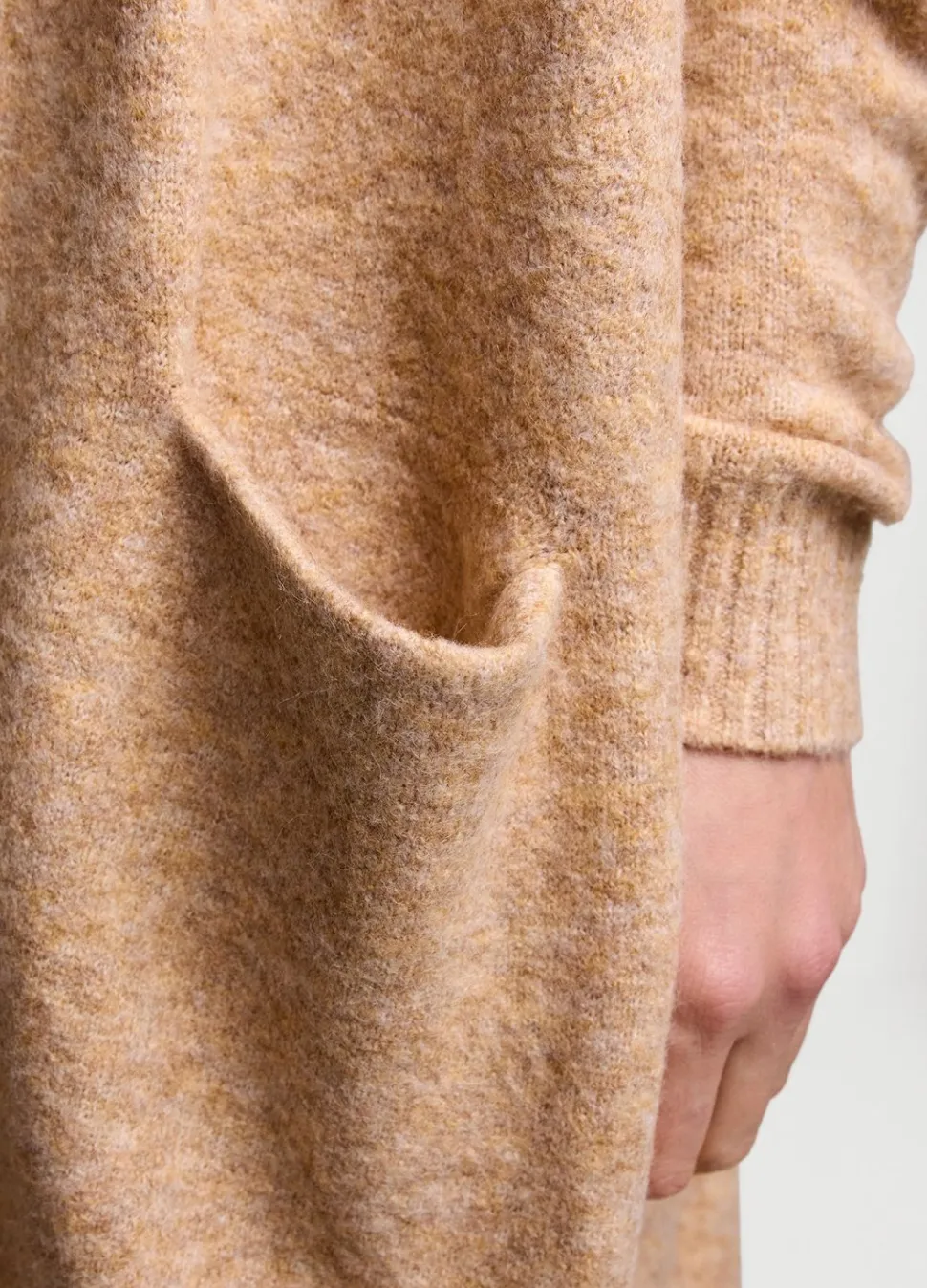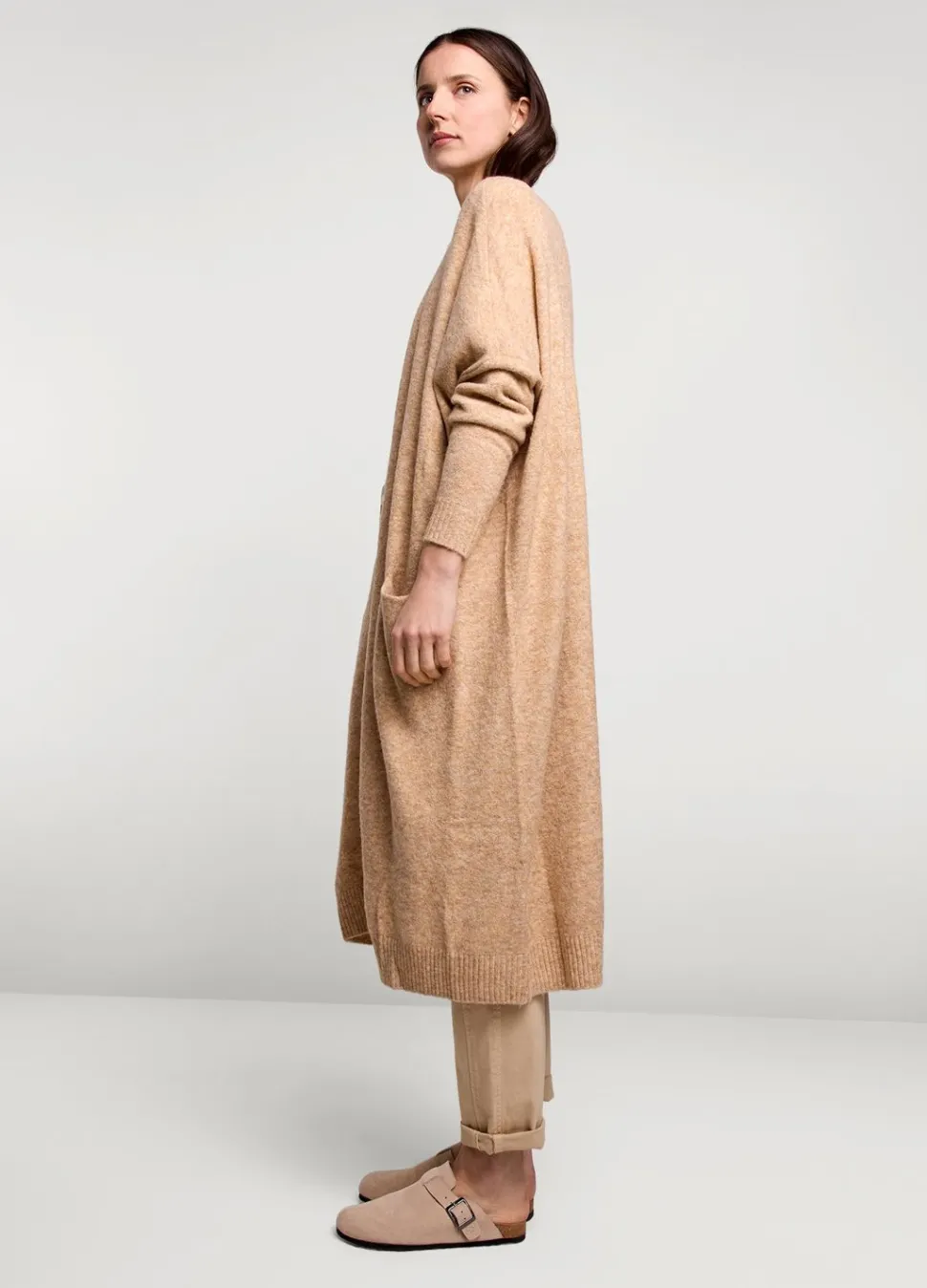 Licht Oversized Vest Op Knielengte. Het Open Vest Is Gebreid In Gemêleerd Garen En Voorzien Van Blinde Zakken