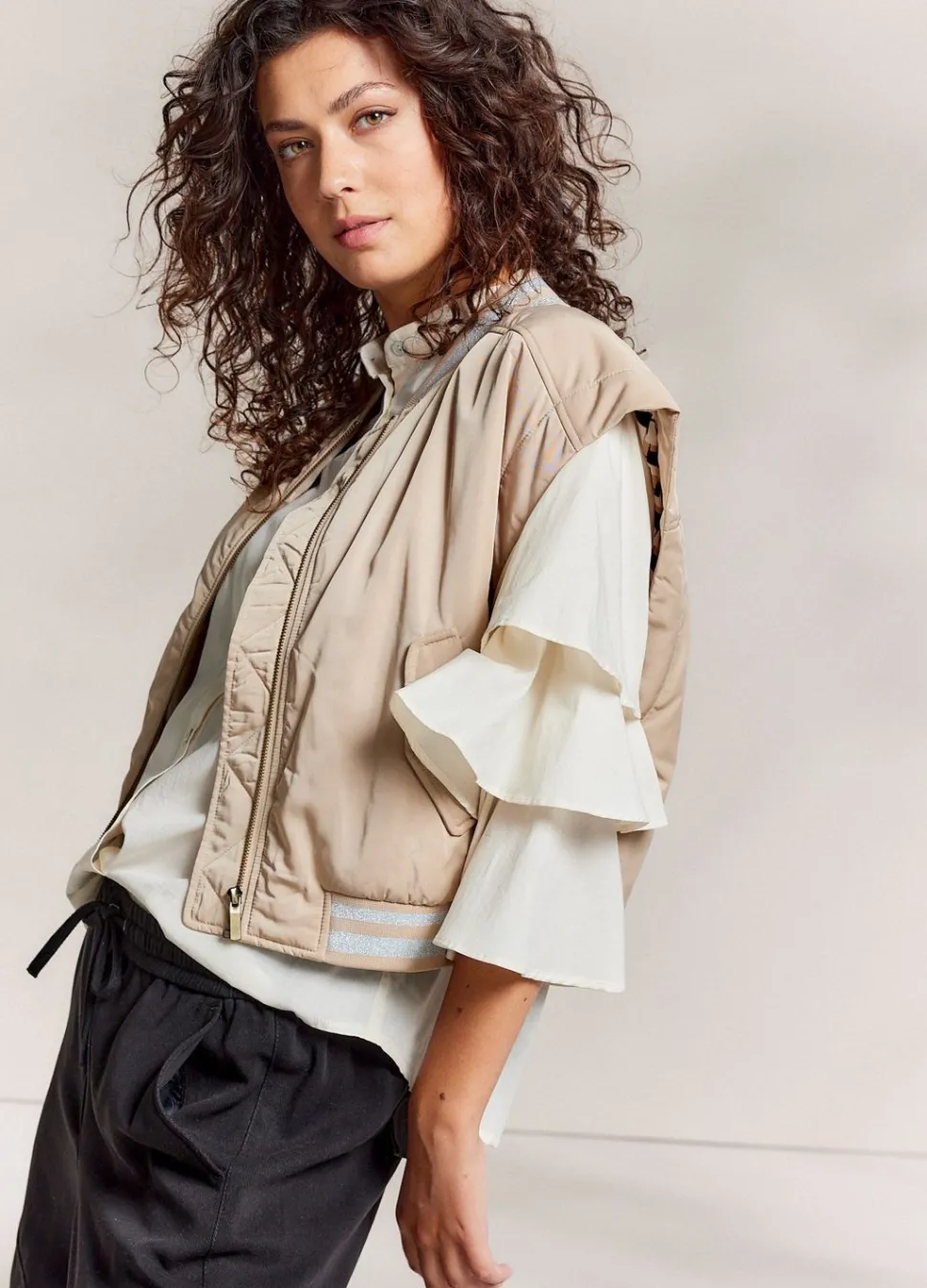 Mouwloos Bomberjack Met Een Ruime Pasvorm. Het Jack Heeft Een Ritsluiting En Gestreepte Ribdetails.
