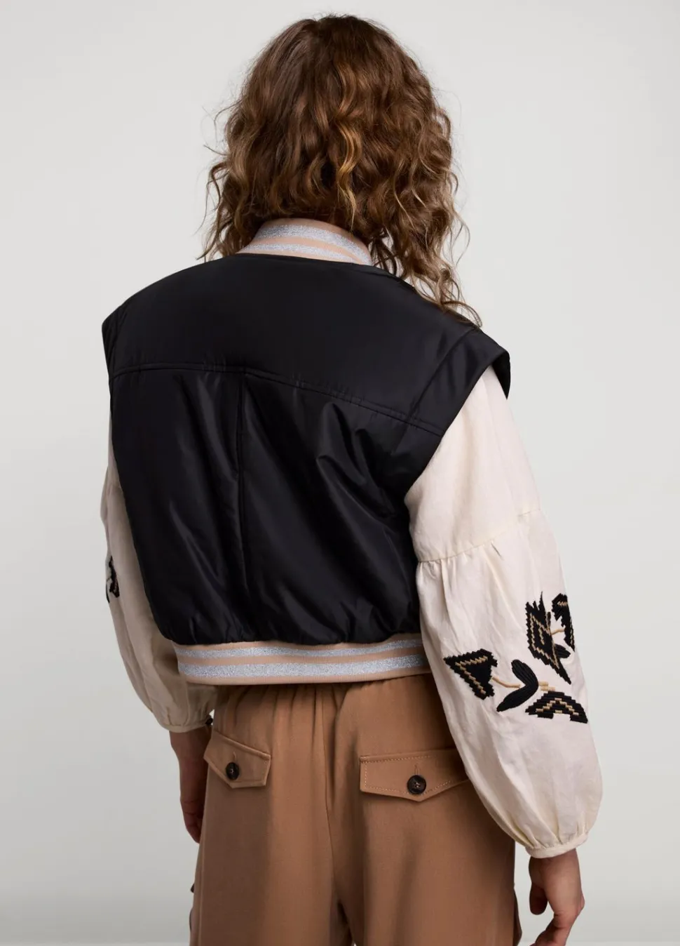 Mouwloos Bomberjack Met Een Ruime Pasvorm. Het Jack Heeft Een Ritsluiting En Gestreepte Ribdetails.