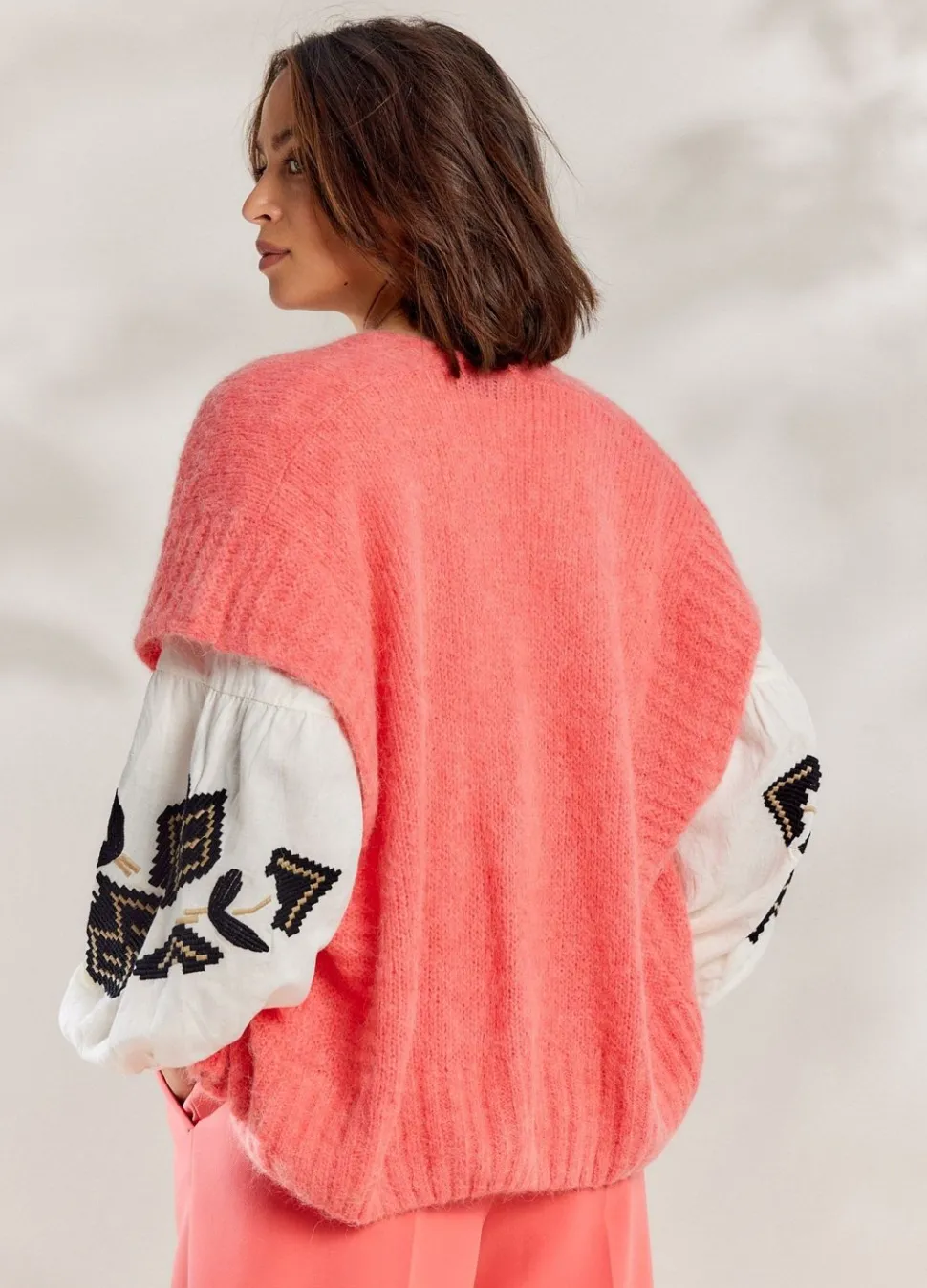 Mouwloos Open Vest In Een Zacht Mohair Blend Garen. Het Vest Heeft Subtiele Rib Details Langs De Boorden En Aan De Zijkant Van Het Vest.