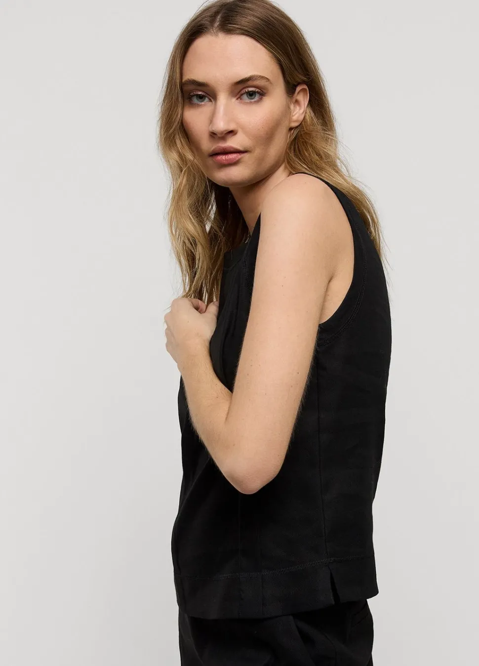 Mouwloze Top Met Een Aangesloten Pasvorm In Een Linnenmix. Op De Voorkant Is De Stof Geplooid Door Twee Coupenaadjes.