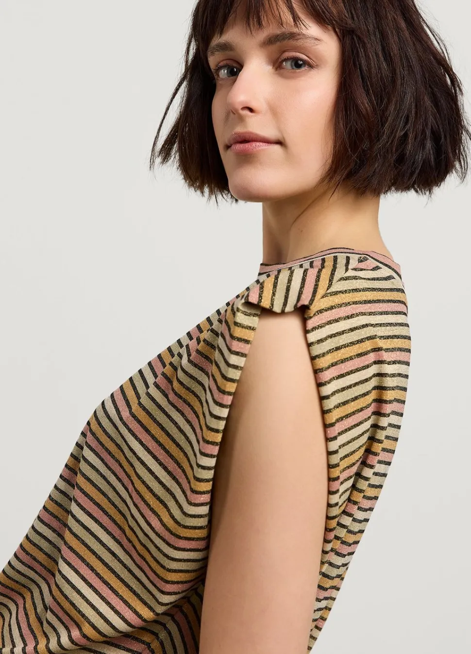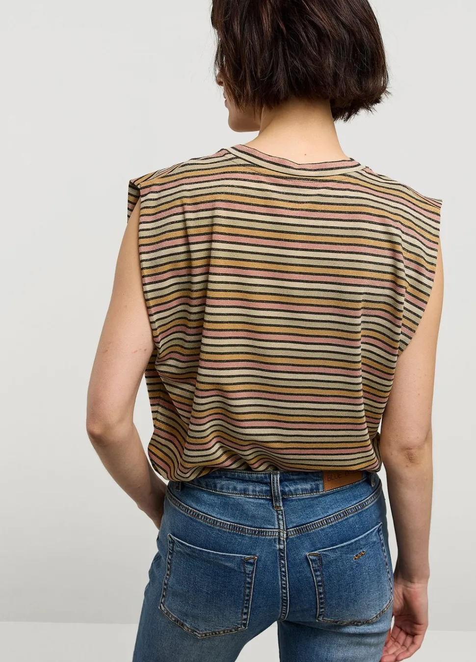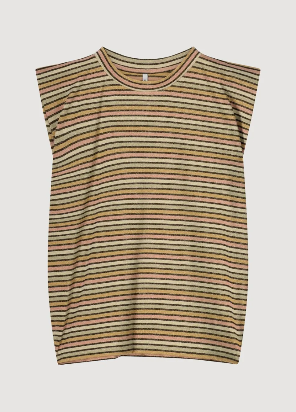 Mouwloze Top Met Een Relaxte Pasvorm, Gemaakt Van Een Rekbare Jersey Met Glinsterend Metallic Garen. De Top Heeft Een Ronde Halslijn En Een Multicolor Streepjespatroon.