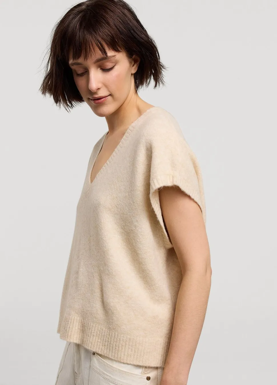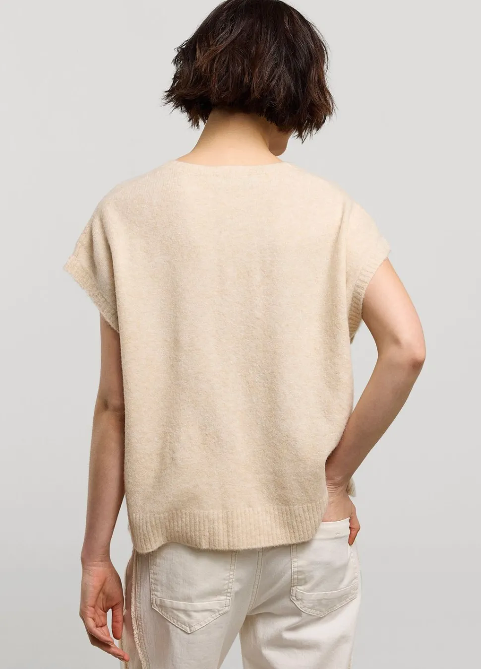 Zachte Oversized Trui In Gemêleerd Garen. De Mouwloze Trui Heeft Een Diepe V-Hals En Wijde Armsgaten.