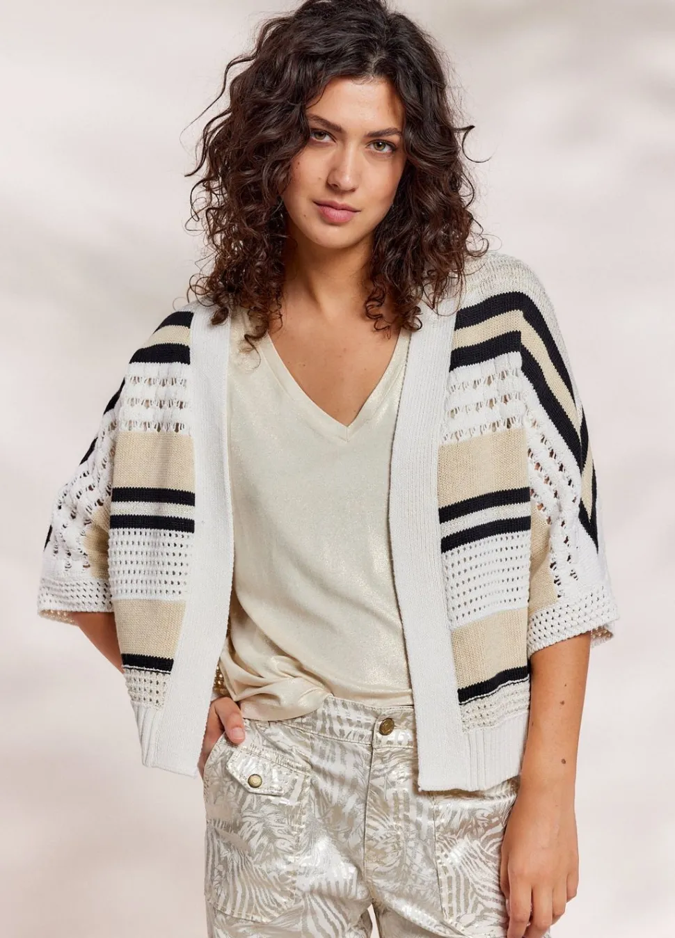 Open Vest Met Korte Mouwen, Gebreid In Meerdere Garens En Steken. Het Vest Heeft Een Oversized Fit En Verlaagde Mouwen.