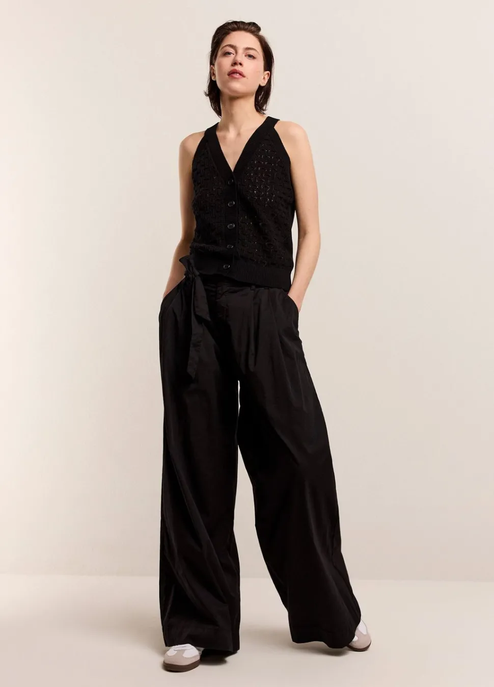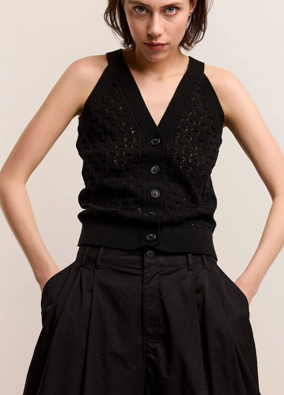 Opengewerkte Haltertop In Een Fijne Ajoursteek. De Top Heeft Een Knoopsluiting En Ribgebreide Boorden.