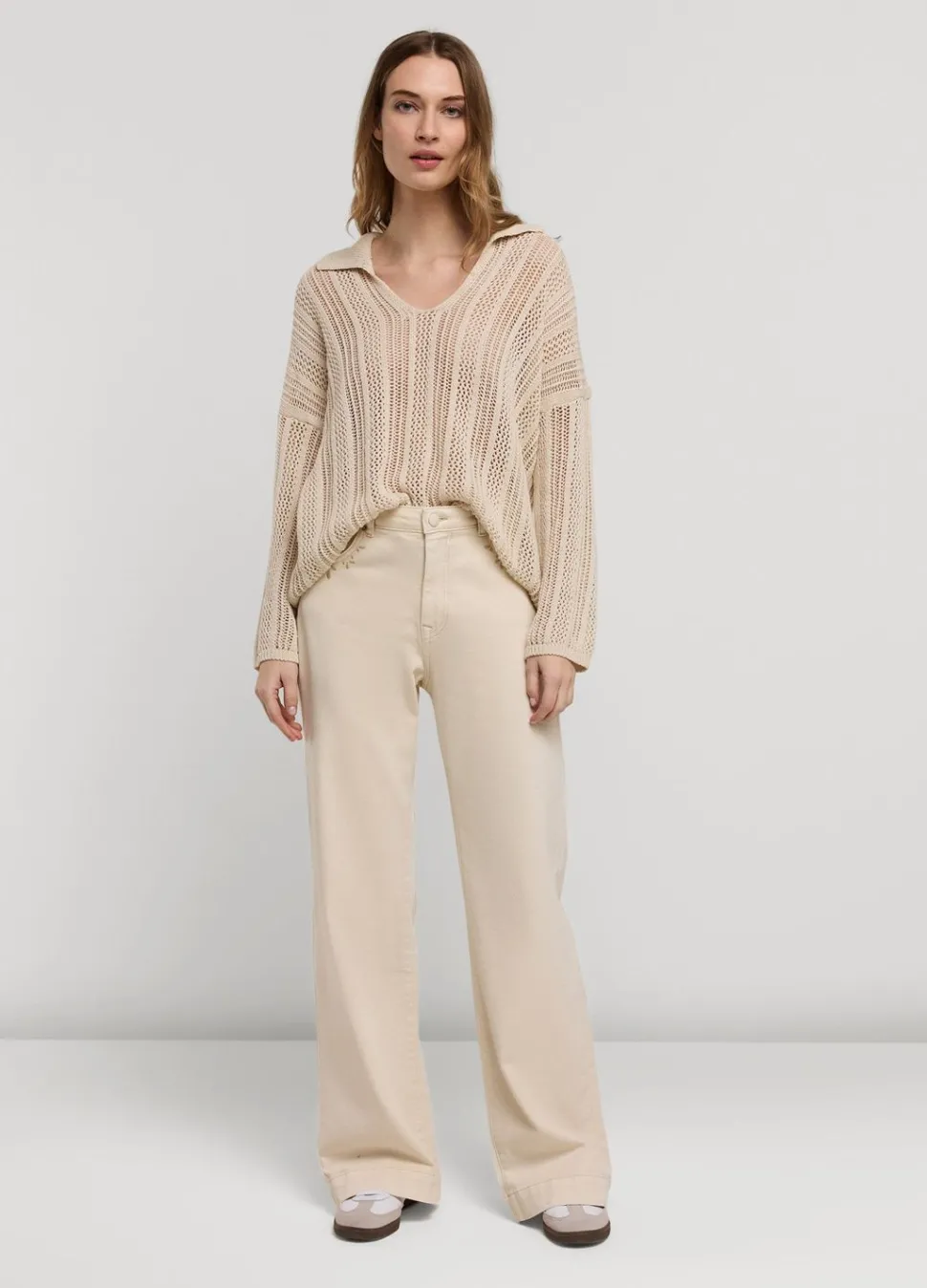 Opengewerkte Trui Met Verschillende Gaatjesmotieven. De Trui Heeft Een Oversized Fit En V-Hals Met Polokraag.
