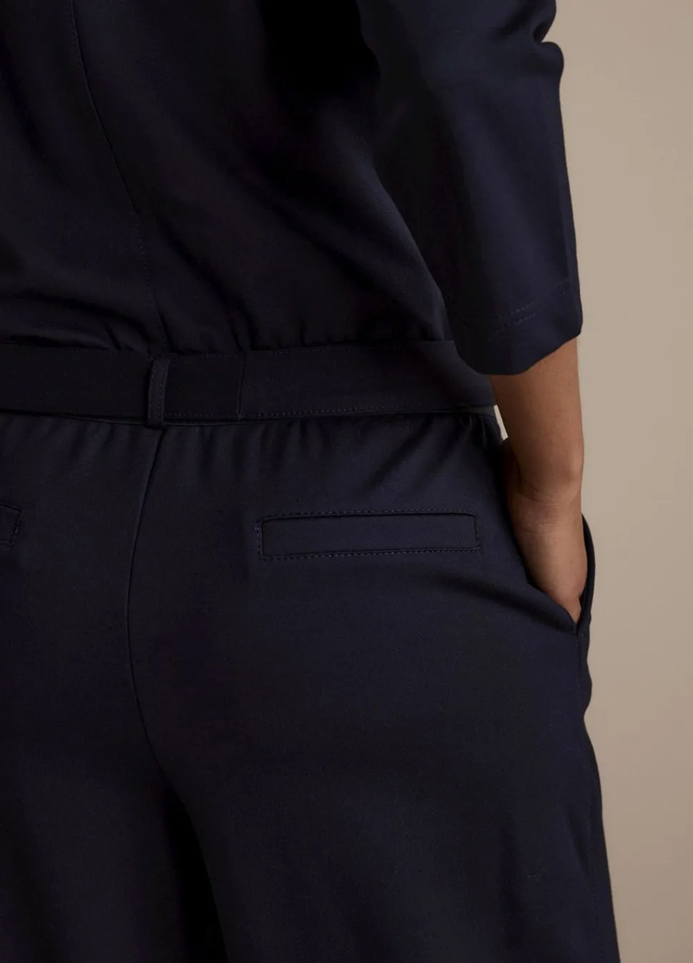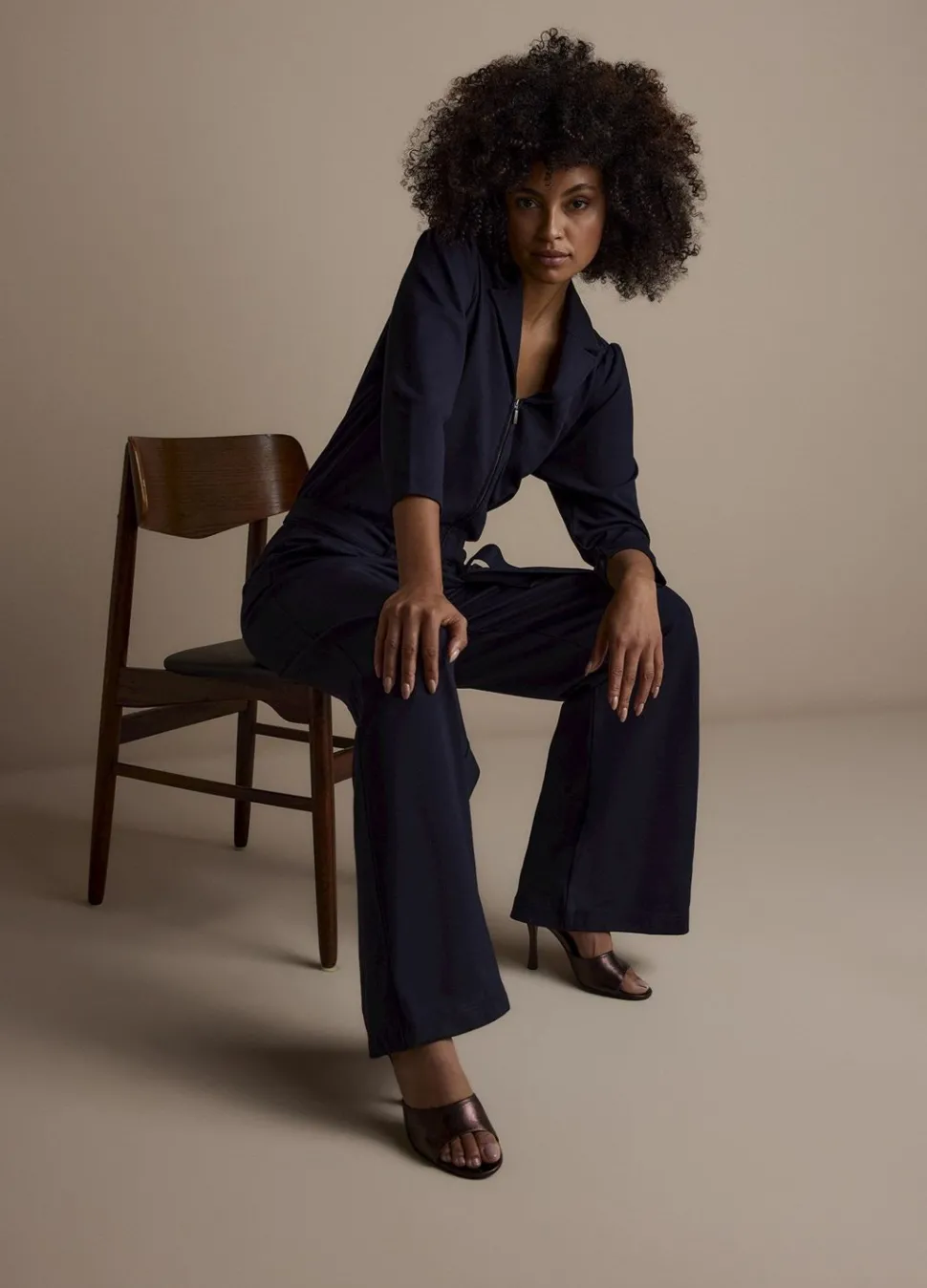 Deze Punto Milano Jumpsuit Combineert Comfort En Elegantie In Één. De Reverskraag, Metalen Rits En Wijde Rechte Pijpen Met Persvouw Geven De Jumper Een Elegante Uitstraling, Terwijl De Zachte Stretchstof En Een Comfortabele Fit Geven. De Jumpsuit Heeft Licht Gepofte ¾ Mouwtjes, Steekzakken Voor Een Nep Paspelzakjes Achter. Combineer ‘M Met Een Riem In De Broeklusjes Voor Extra Accent Op De Taille.