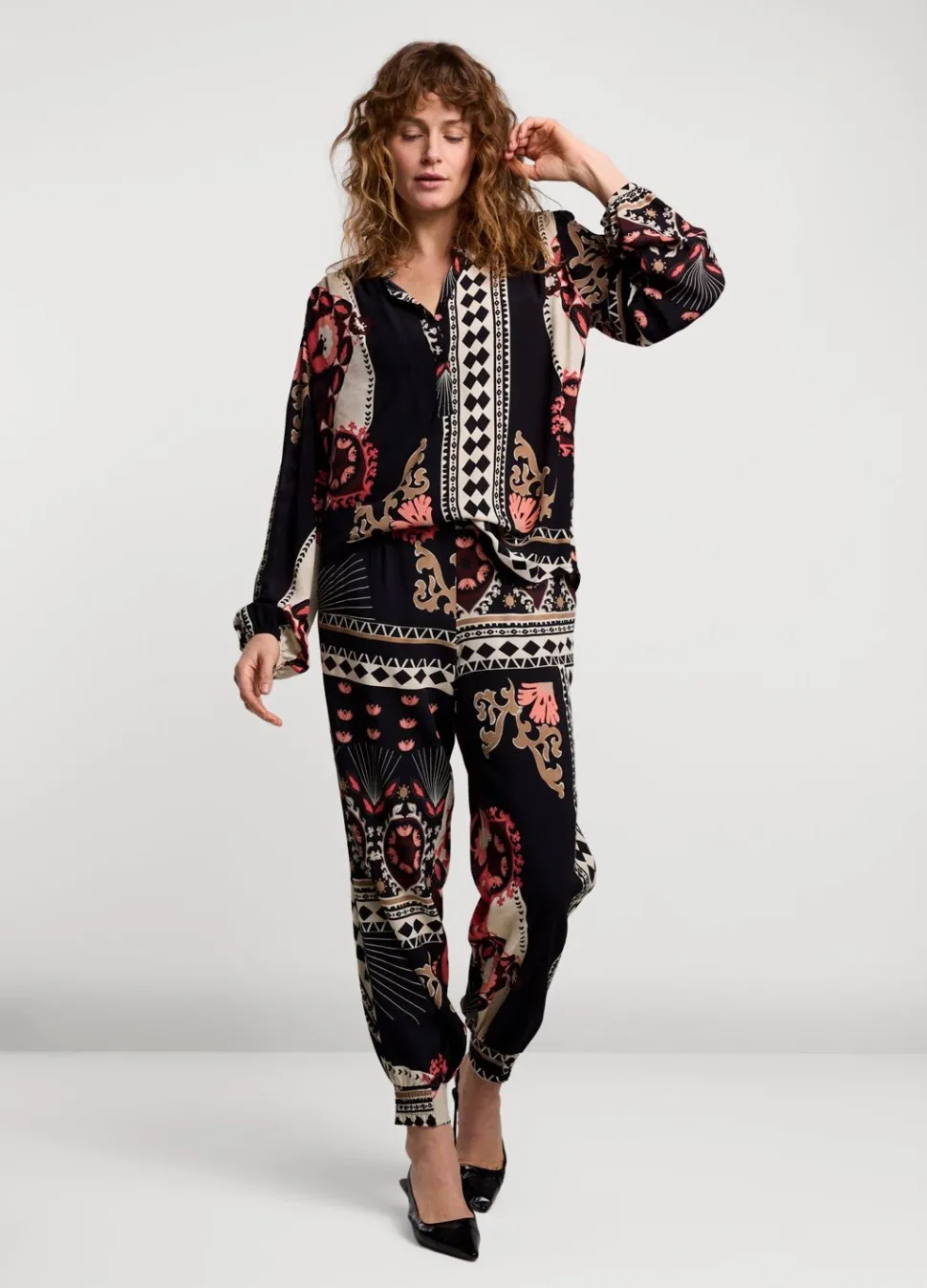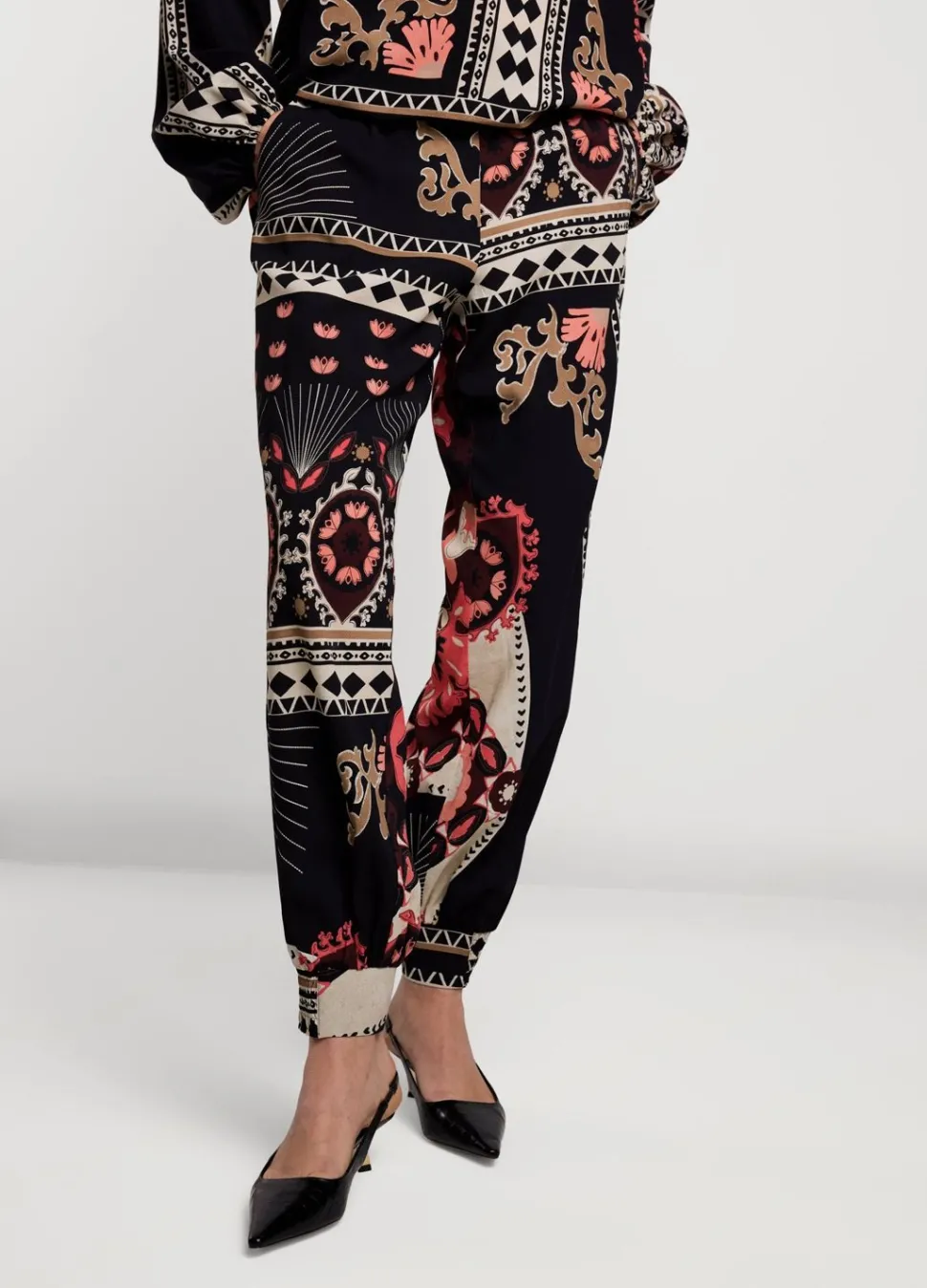 Soepelvallende Pofbroek Met Een Gladde Tailleband Voor En Elastiek Achter. De Pijpen Zijn Afgewerkt Met Gedeeltelijk Gesmokte Boorden. Iedere Broek Is Uniek Door De Willekeurige Plaatsing Van De Print.