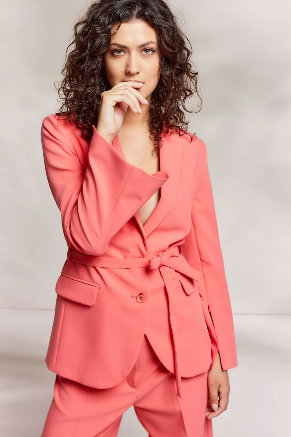 Boyfriend Blazer In Soft Foam Stof Met Ceintuur In De Taille En Klepzakken Op Het Voorpand. Het Jasje Heeft Blinde Ritsen In De Mouwen Voor Een Speels En Luchtig Effect.