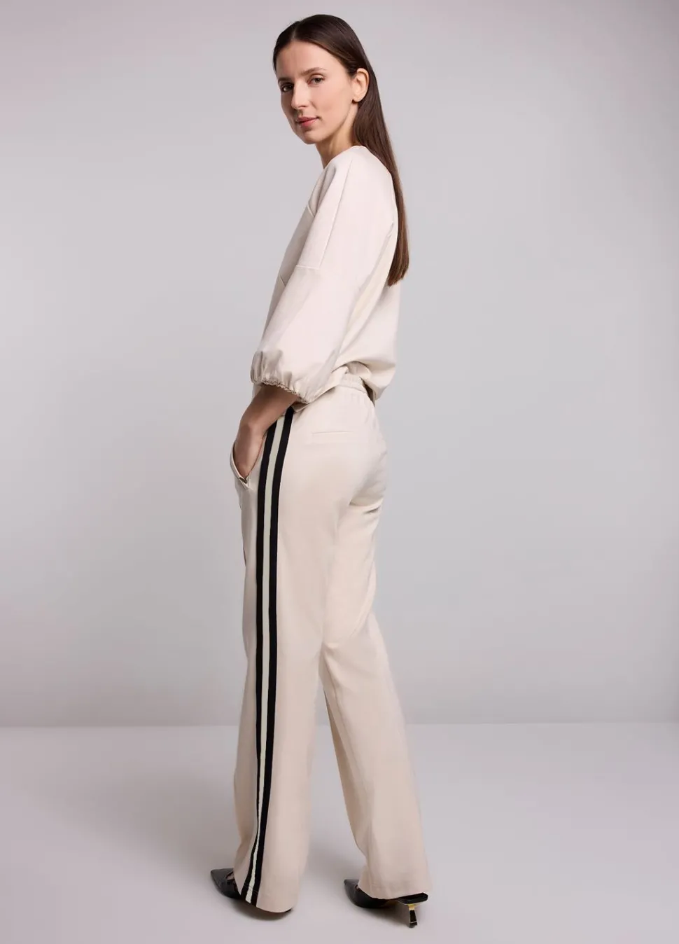 Sportieve Broek Met Rechte Pijpen Met Een Contrasterende Tape Op De Zijnaad. De Broek Heeft Een Elastische Taille Met Koord En Schuine Strookzakken Met Rits Voor.