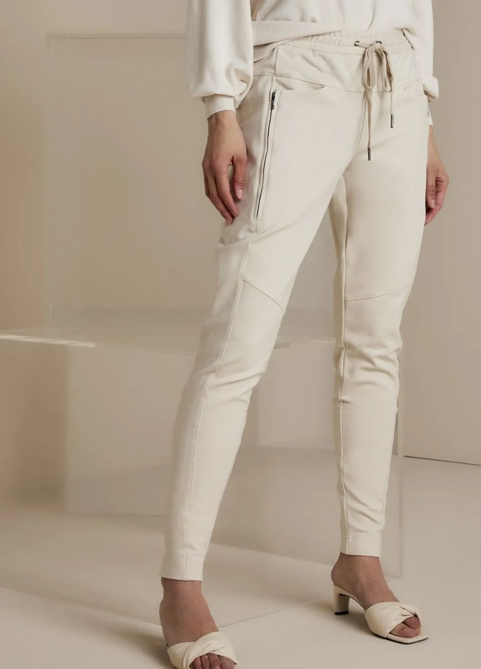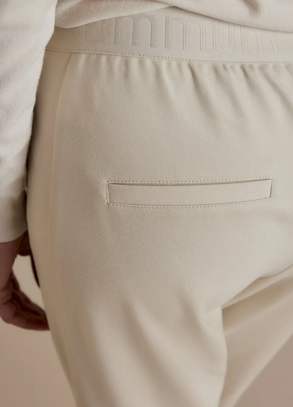 Een Smal Toelopende, Sportieve Punto Milano Broek Met Elastiek Met Summum Logo Aan De Achterkant En Een Trekkoord In De Tailleband Voor. De Broek Heeft Een Dynamisch Lijnenspel Aan Stiksels En Deelnaden, Liggende Steekzakken, Er Zitten Ritsen In De Zakken Voor Een Speels Effect Voor En Strookzakken Achter.