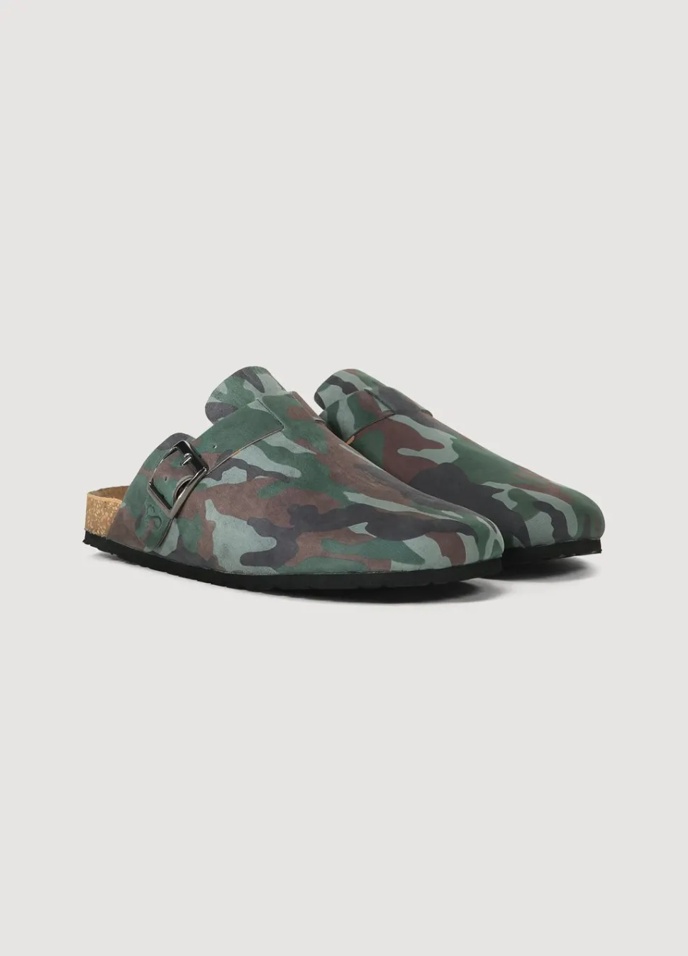 Suède Leren Instapper Met Gesp. De Klomp Heeft Een Zool Van Kurk En Rubber En Is Gevoerd Met Leer.