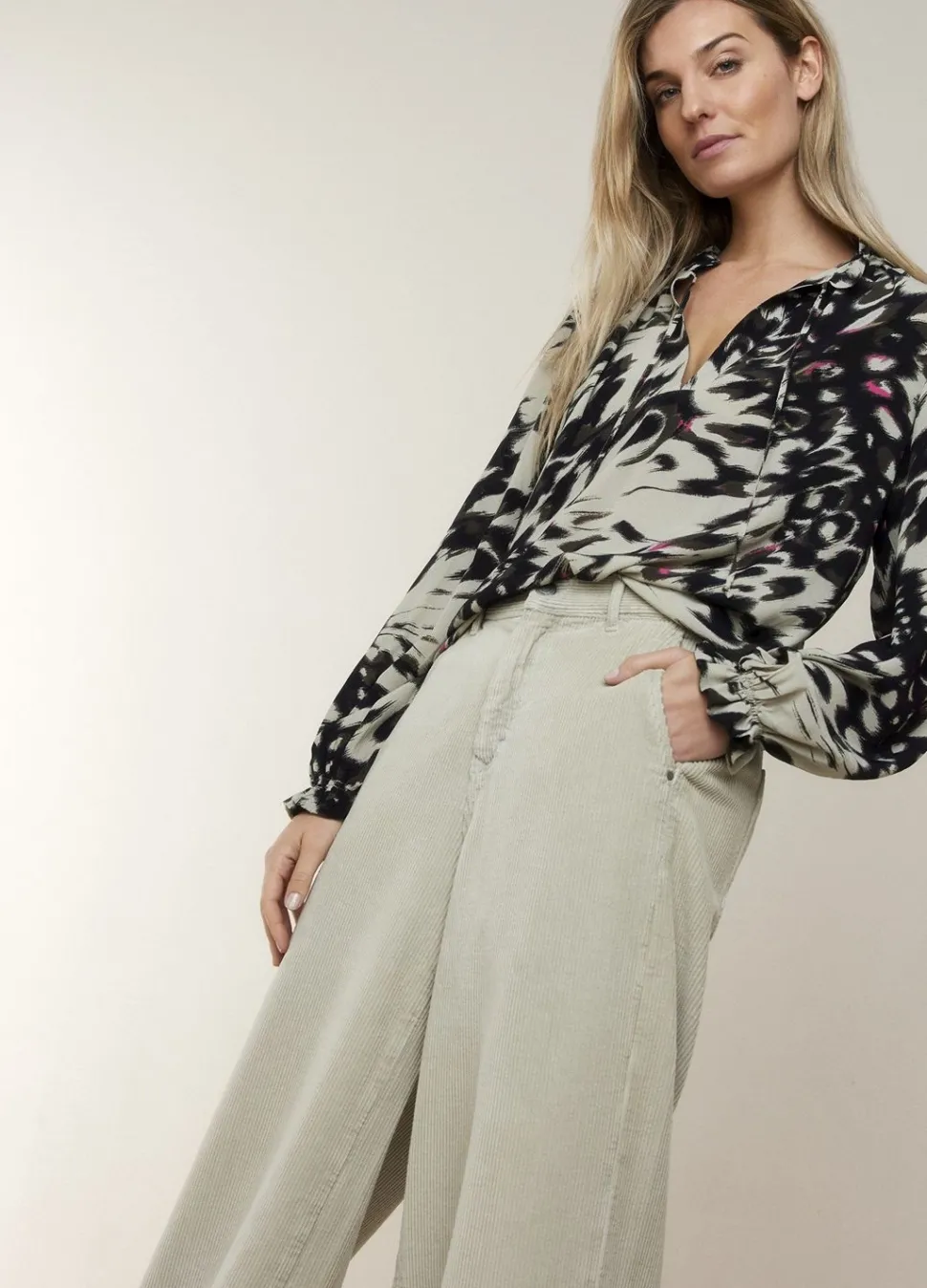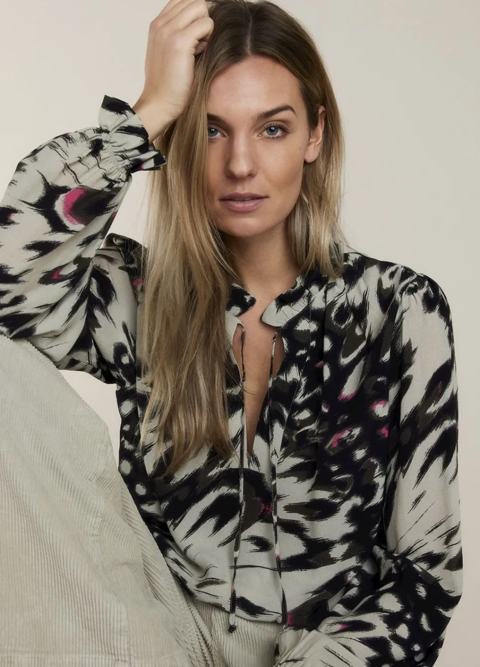 Top Met Abstracte Vlinderpint In Een Soepele, Dichte Kwaliteit Stof. Het Opstaande Kraagje En De Manchetten Van De Pofmouwen Zijn Versierd Met Ruches.