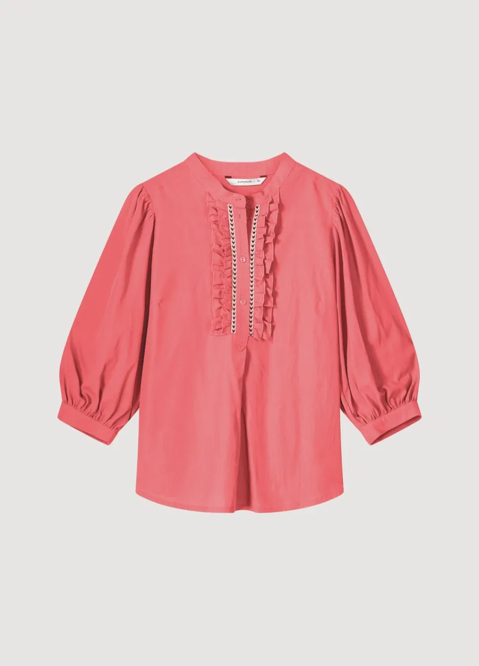 Top Van Zacht Lyocell Katoen Met Pofmouwen Tot De Elleboog. De Blouse Heeft Een Opvallende Knopenlijst Voorzien Van Contrasterend Biesband En Een Dubbele Rij Ruches.