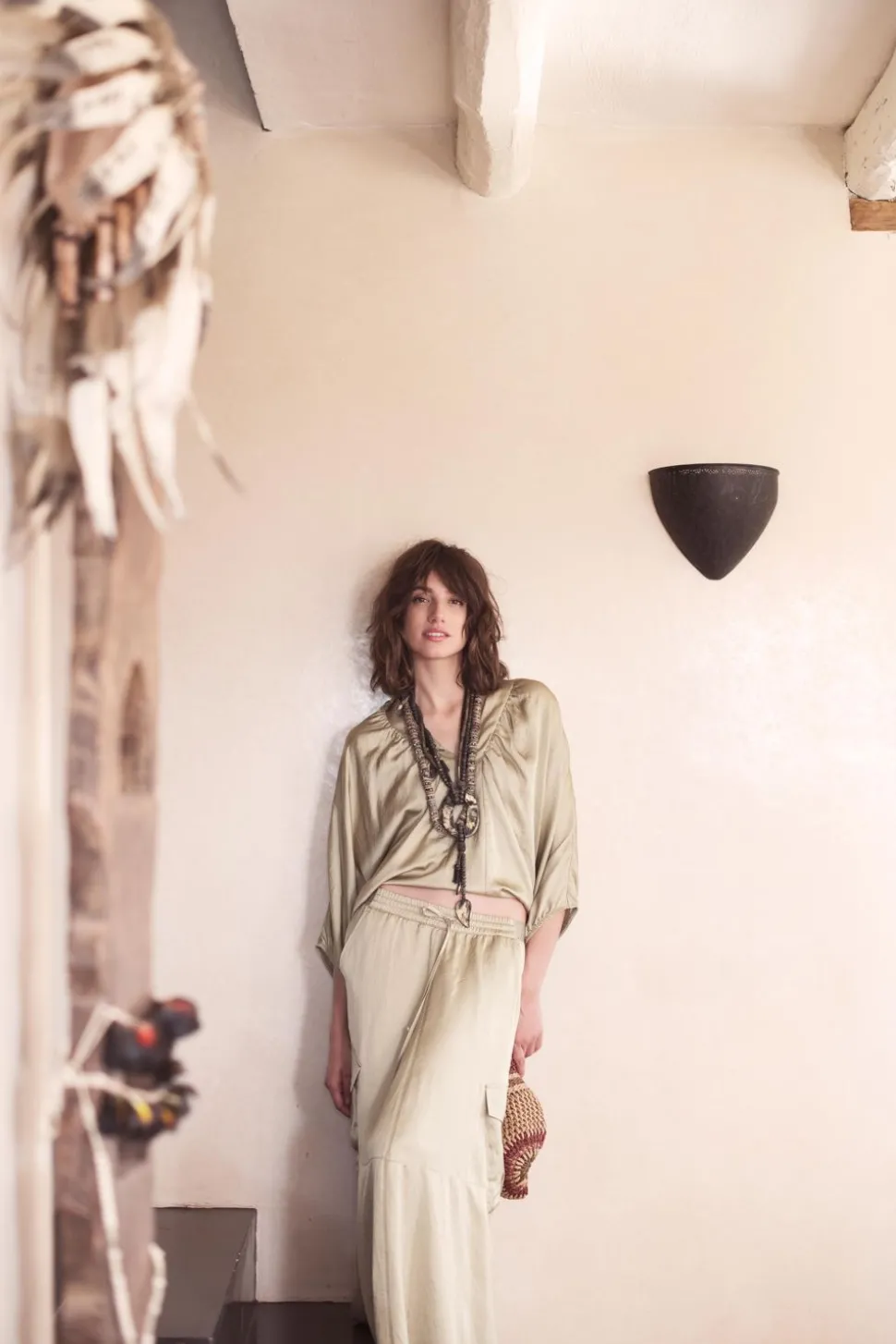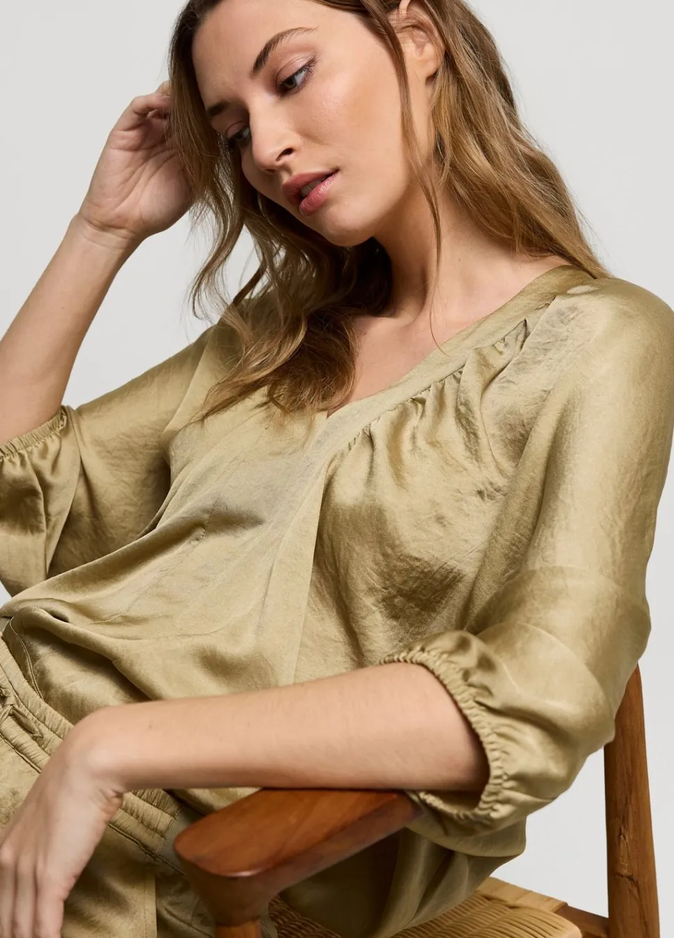 Silky Satin Top Met Vleermuismouwen. De Top Heeft Een Geplooide V-Hals En Een Brede Accentstrook Rondom De V-Hals En Op De Voorkant.