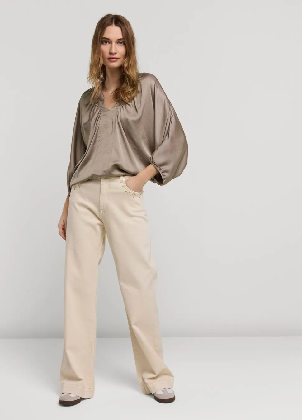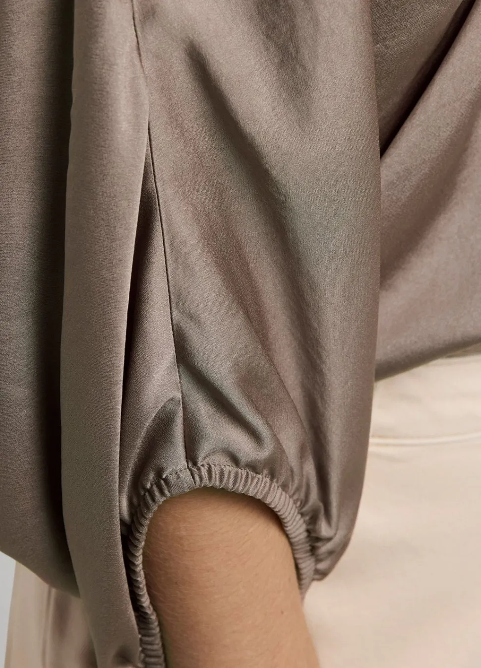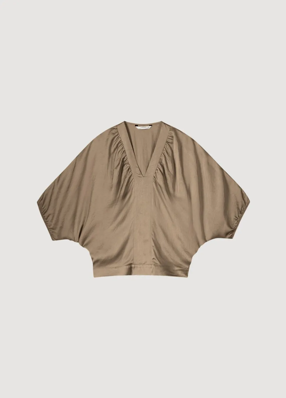 Silky Satin Top Met Vleermuismouwen. De Top Heeft Een Geplooide V-Hals En Een Brede Accentstrook Rondom De V-Hals En Op De Voorkant.